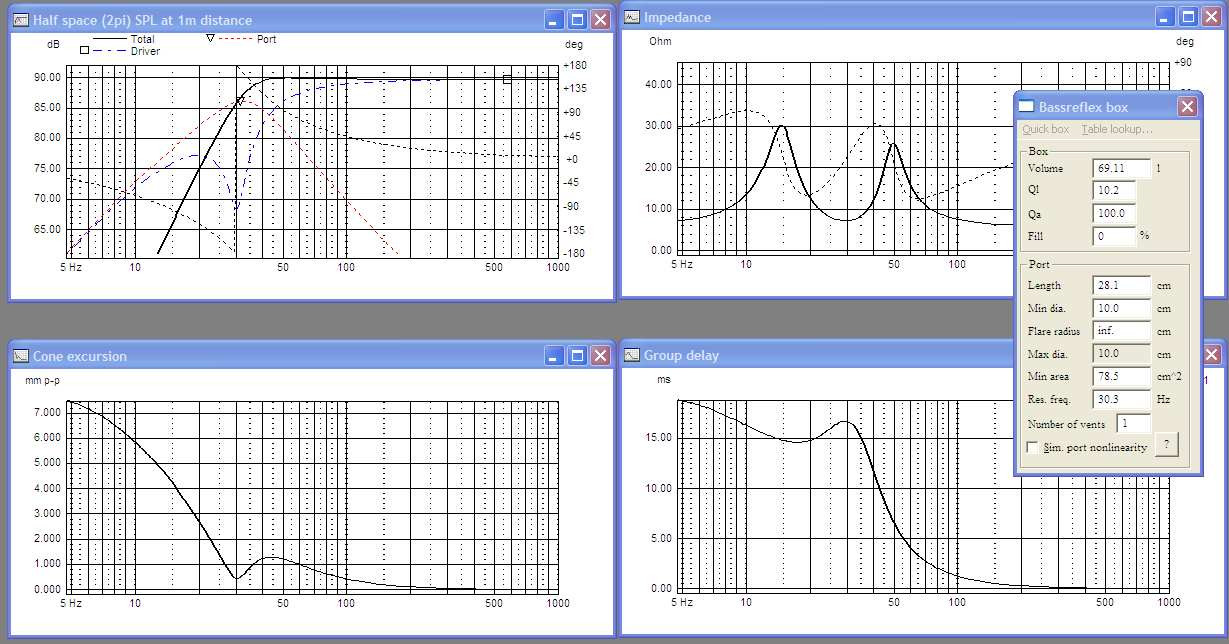 Nie je to až tak dramatické, GD výraznejšie rastie až na kmitočtoch blízko ladeniu BR, viď príklad s DSA315 (ktorý je v reále delený v dvojpásme až tesne pod 1000Hz a nič nepriaznivé sa nekoná)..Meranie v blízkom poli je prakticky identické so simuláciou. Pri voľbe vhodného meniča je BR vždy lepší ohľadom rozsahu dolu (aj skreslením pri vyšších SPL..). A je dobré nezamieňať nedostatky miestnosti s vlastnosťami BR ozvučnice.