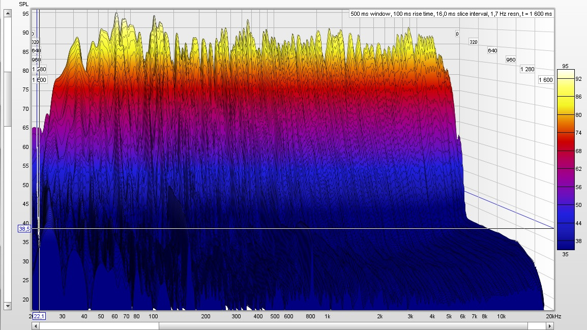 máš to už teď moc pěkný. Já v těch grafech vidím 2 věci. Za prvé, bych měl trochu strach přidávat v EQ 6,4db na 1,3kHz. To si myslím že je už dost a mohl by jsi to i slyšet. Druhá věc je, myslím možná trochu nepochopení jak změřit dobu dozvuku. Ten spectogram už bude ukazovat okolní hluk nad 90Hz. Protože je potřeba si uvědomit že žijeme už tak v hlučném prostředí. A tak v domácích podmínkách je obtížné dosáhnout doporučovaný útlum zvuku na 0,3-0,5s při -60dB. Takto o tom hovoří spousta publikací o akustice. To ale bude platit pro velké samostatné poslechovky nebo koncertní sály. Jenže když v obývací místnosti máme klidně i 50dB okolního "šumu"(hlasité lednice,rekuperace,topení,hluk za okny...) a pak v tomto prostředí chceme měřit útlum 60dB tak by jsi musel měřit až na hranici možností beden možná i zesilovače. Proto si myslím že je potřeba měřit jen ty podmínky ve kterých doopravdy posloucháme. Tedy když budu mít poslechovou hlasitost kolem 85dB. Tak budu měřit v tomto bodě. Pak je potřeba zjistit jaká je hlasitost okolního hluku. A následně měřit dozvuk třeba jen na útlumu 35dB. Pak to měření odpovídá realitě. Pro kontrolu to chce zkusit změřit poslechovou hlasitost a +20dB na dynamické špičky. A to spíše jen pro kontrolu co se děje. Protože do tohoto stavu se u většiny nahrávek nedostaneš. Toto je příklad mojí ložnice s hornami. Dobu dozvuku jsem roztáhl na 1,6S aby bylo vidět kolik zůstává běžného hluku v pozadí. A to je místnost kde nic není co by dělalo hluk.