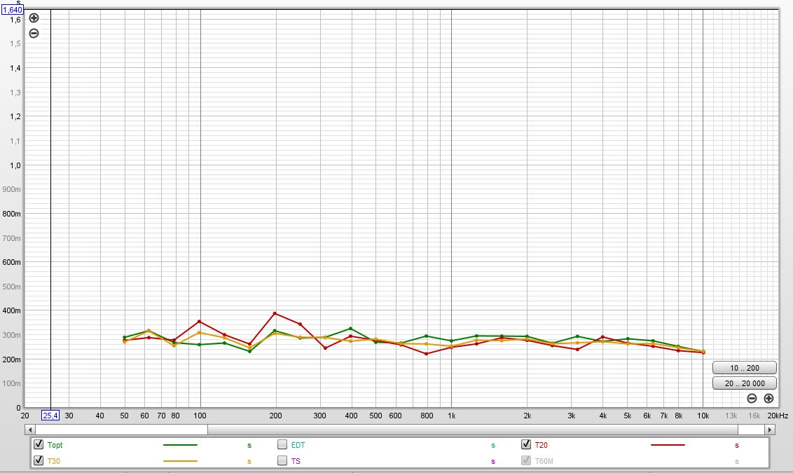 weiron: REW meria dozvuk T60 pomocou T20 a T30, takže pokles o 20 a 30 dB. Okolitá hladina hluku 50 dB je už veľa, väčšinou býva medzi 30 až 40 dB. Ale merať pri o trochu vyššej hlasitosti (medzi 75-90 dB) by výsledkom z merania pomohlo.
