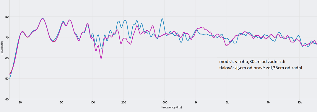 Pravou bednu jsem posunul cca 45cm od pravé zdi, od zadní je 35cm, a změřil ARC Genesis aplikací - je tam i původní umístění pro porovnání