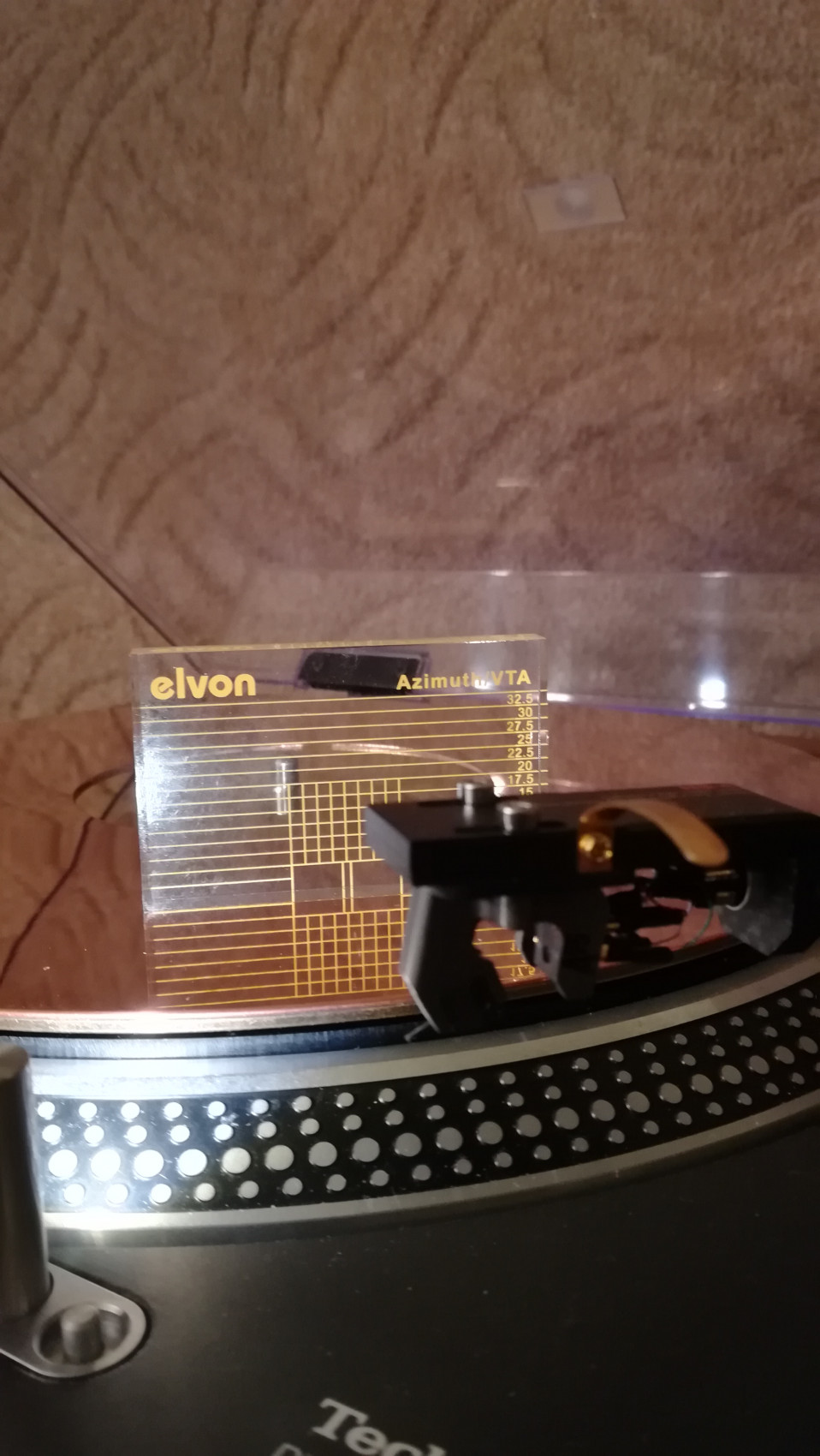 Dále jsem se začal tedy soustředit na správný úhel přenosky na hlavě raménka. Využil jsem přiložené šablonky od ProJectu a vše vyrovnal - snad správně - viz obrázek.