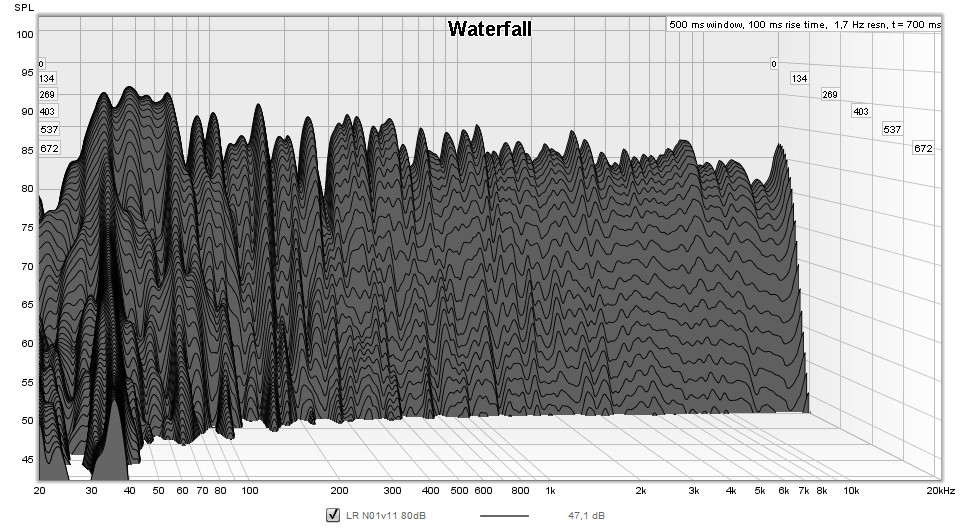 Místnosti nerezonují čistě náhodou, jak se mylně domníváš, ale v závislosti na svých rozměrech. Podle její délky, šířky a výšky se tvoří módy. A ano, v mé místnosti je jeden z módů právě kolem 30 Hz. Není to nic neobvyklého. Tzn. i relativně malé vybuzení té frekvence (viz frek. průběh) vyvolá poměrně výrazný dozvuk (viz waterfall).