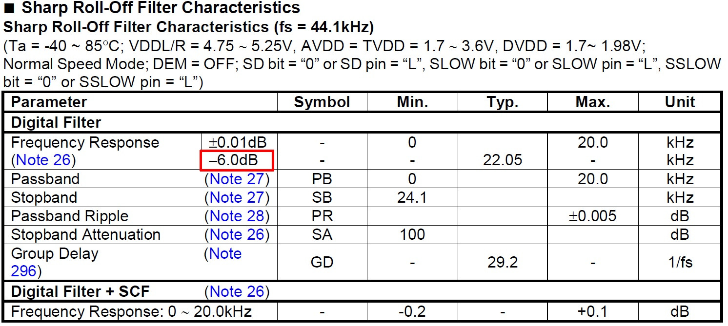 Tu je podobny filter s poklesom tiez -6 dB na 22 050 Hz (fs/2) ale je menej strmy ( na 24,1kHz ma cca iba -66 dB kdezto pre AK4493 pisu -100 dB)