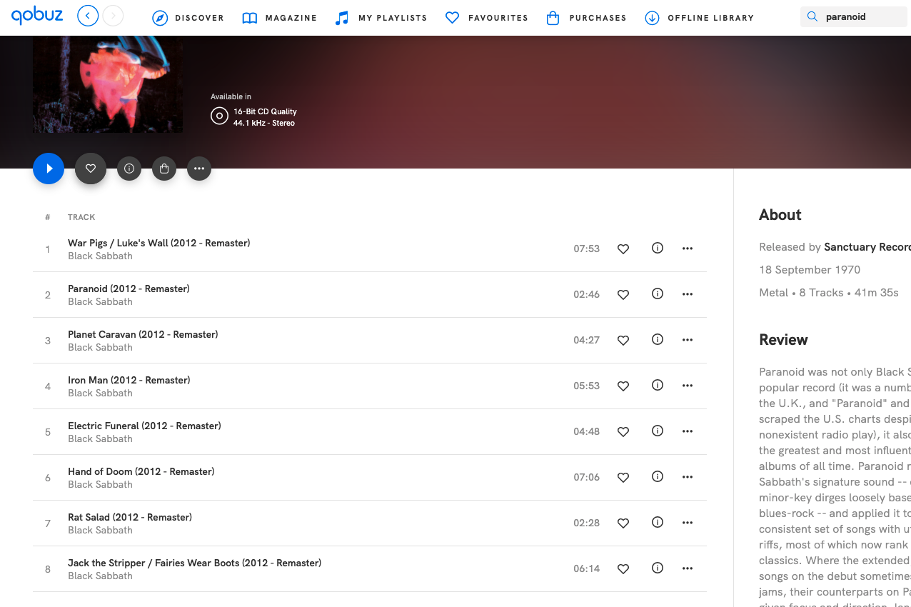Nejvíc se Qobuz verzi blíží toto:Antony píše: ↑10 srp 2023 13:09A pokud se někdo namáhal najít album Paranoid v digitální edici z roku 2012, našel jen jednu vyrobenou speciálně pro Argentinu. Což nebude ta celosvětově šířená streamingem. Poskytovatel streamingu neuvádí skutečnou edici. Jednak jich bylo víc, jednak byly v jiných letech. Což opět nezjistíme. To jen uživatel "Dark side of the moon" bude sobě potažmo nám nalhávat, že informace uvedena je. A když je přistižen, neváhá osočovat druhé.