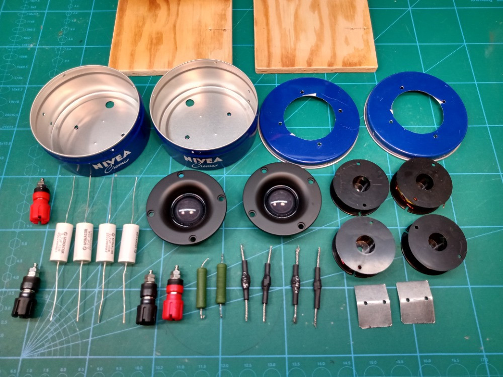 Páč jsem měl určitý pochybnosti, tak jsem se rozhodl, že supertweetery nejprve umístím do improvizovanejch mini ozvučnic, ve kterejch schovám i vyhybku.K tomuhle účelu se mi velmi dobře hodily dvě odložený plechovky od krému NIVEA a kousky překližky na podstavce.