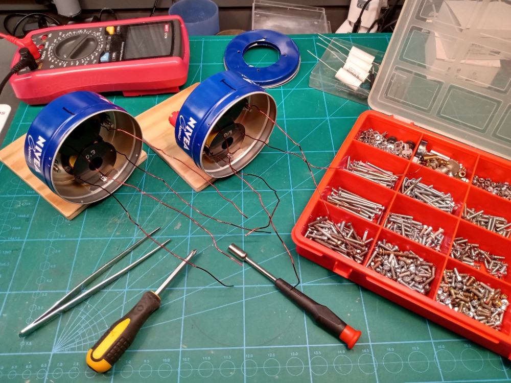 Výroba supertweeteru pokračovala montáží komponentů vyhybek do krabiček od krému NIVEA.