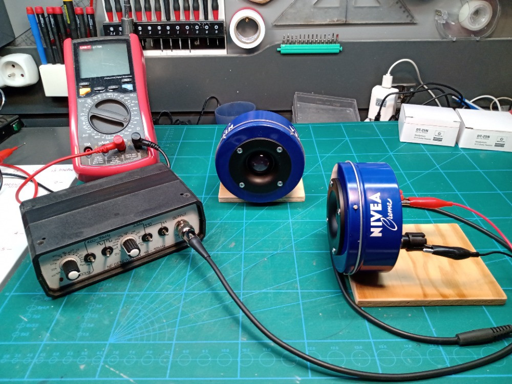 Takže...tady je zase další obrázek.NIVEA ozvučnice jsou kompletní, probíhá měření funkčnosti zapojení malým bateriovým generátorem.A ejhle, jeden měnič píská, druhej ne.Typický, zapoměl jsem proletovat spoj mezi vstupním odporem a kondenzátorem.Teď už pískaj oba.