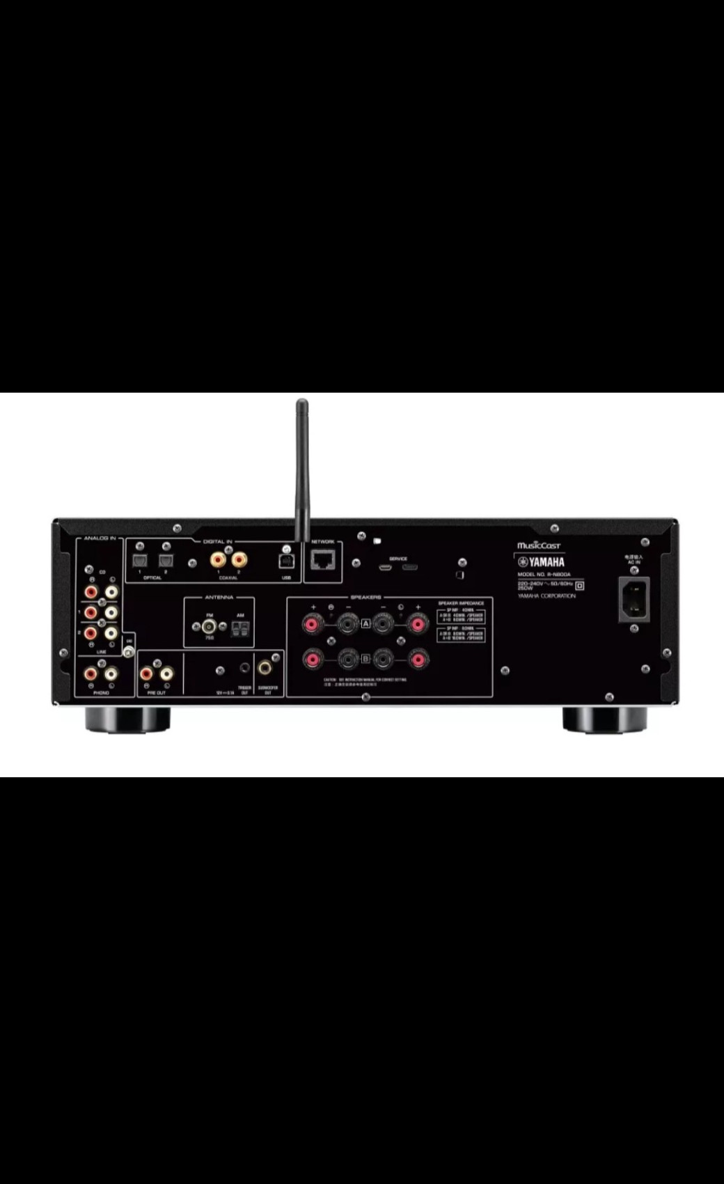 Stereo receiver, 2×100W, MusicCast, WiFi, LAN, DLNA, Air Play 2, Spotify, TIDAL, DEEZER, Bluetooth, FM/DAB, internet. rádio, 384kHz/32bit DAC, YPAO, USB, 4x analog. audio, 2x opt. výstup, 1x koax. výstup, Sub out, Pre out, výstup na sluchátka