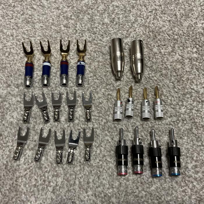 Redukce RCA - XLR (XLR vstup) 2ks, (á 50 Kč kus). Rhodiované vidličky 10 ks (á 30 Kč). Nakamichi pozlacené banánky 8 ks (á 40 Kč). Nakamichi vidličky 4 ks (á 90 Kč). Roztahovací rhodiované banánky 4 ks (á 110 Kč).