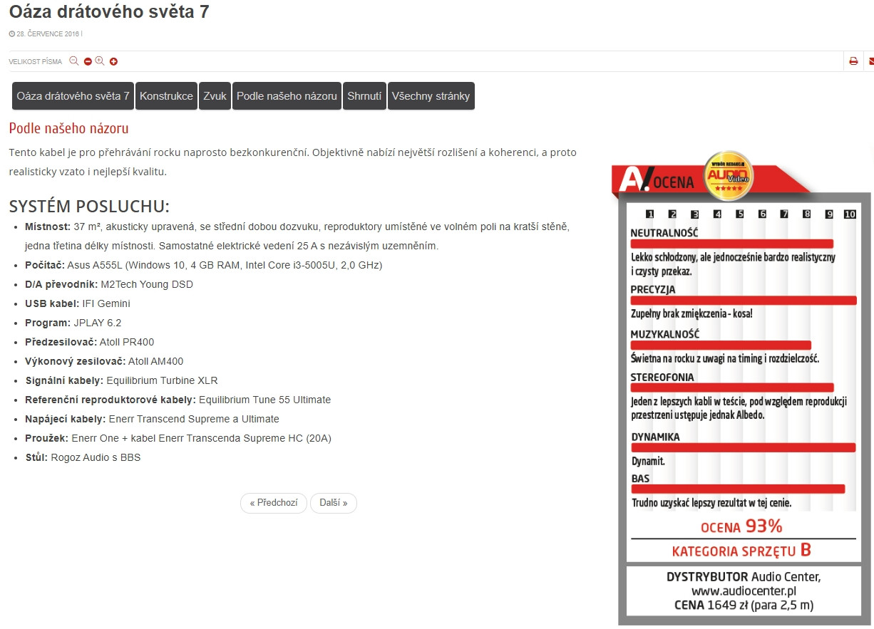 Prodám WireWorld Equinox 8 v délce 2,5m osazený banánky, koncovky jsou šroubované, dají se dokoupit vidličky. Zakoupen v 2021 za 20000Kč, nyní se prodává za cca 24000Kč. Důvodem prodeje je jeho relativně vysoká hmotnost, kdy mě za těch pár let vymačkal u mého Exposure 3010S2D zapuštěné terminály tak, že ztratily kontakt. Protože už téměř neposlouchám (když už tak sluchátka) vyřešil jsem kompromisní koupí za ¼ ceny Tellurium Q Ultra Blue II, který má cca poloviční hmotnost a je flexibilnější, zesík má naštěstí zdvojené terminály. Zvuk nižší řady Oasis 7 popsán v testu.