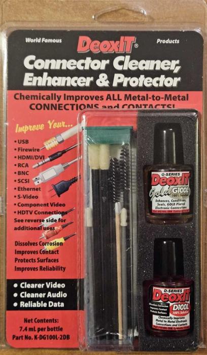 Prodám ultimativní čistící set od fy. Caig DeoxIT, který se skládá z přípravků D5, D100L a Gold G100L. Slouží k očištění, ošetření a ochranu veškerých elektrických kontaktů - napájecích, signálových, repro konektorů a také jejich vodičů před montáží, kontaktů pojistek a pojistkových odpojovačů, apod. U D5 zbývá cca 50 %, u G100L cca 70% a D100L 100 % náplně. Koupeno v USA. Ideální pro periodické ošetřování veškerých elektrických kontaktů v HI-FI sestavě - slyšitelný rozdíl.