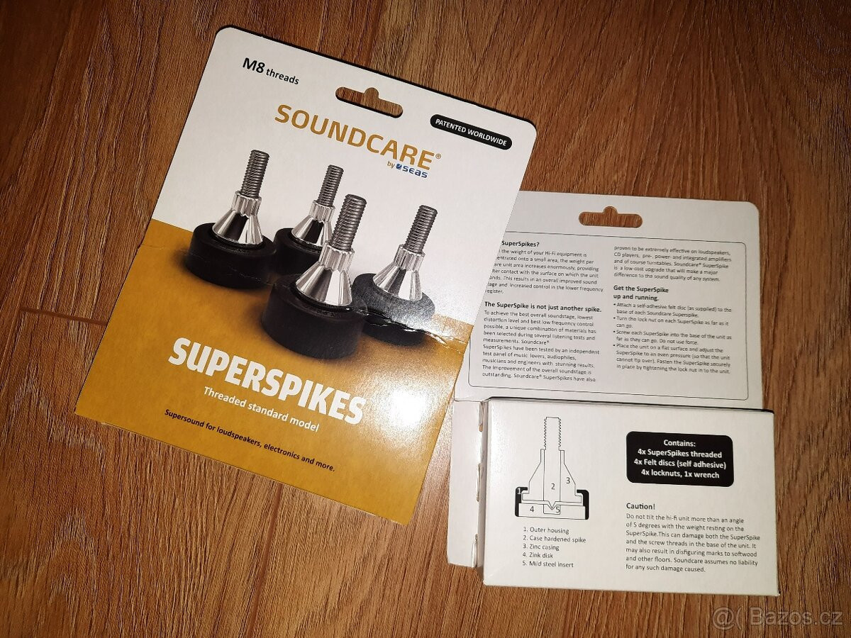 Predám účinné antirezonančné nožičky Soundcare SuperSpikes s integrovaným hrotom pod reprosústavy. Sú kombináciou materiálov rôznych tvrdostí a rezonančných vlastností, aby sa dosiahlo čo najlepšie zlepšenie priestoru zvuku, najnižšia úroveň skreslenia a čo možno najlepšia definícia hlbokých tónov. V ponuke sú dve sady nožičiek so závitom M8. Nožičky sú v stave nových kusov, prvý majiteľ.