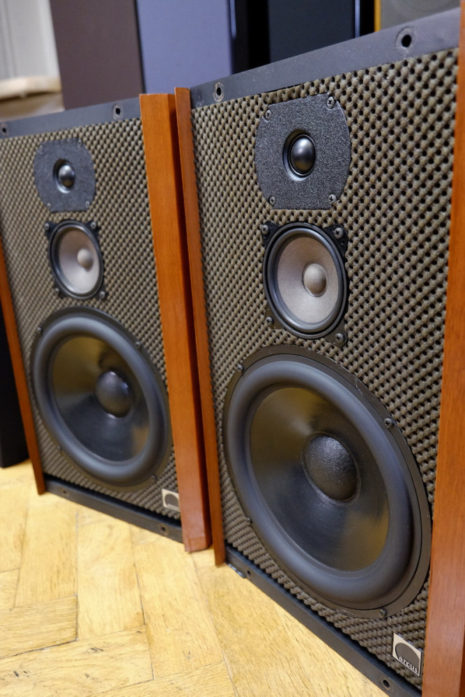 3-pásmový reprobox 80/120W – 6ohm, laděný modifikovaný bassreflex (Time Delay Control) pro optimální impulsní odezvu (tlumený zvukovod s proměnlivým průřezem vyústěný štěrbinou pod bas.reproduktorem), výroba West Germany-Berlin, opticky výborný stav, ořechová dřevěná dýha (v reálu mírně tmavší než na fotkách), 100% funkční, všechny membrány a závěsy jako nové, krycí mřížky a tkanina bez poškození, ozvučnice z kvalitní MDF, čelní stěna tl.25mm