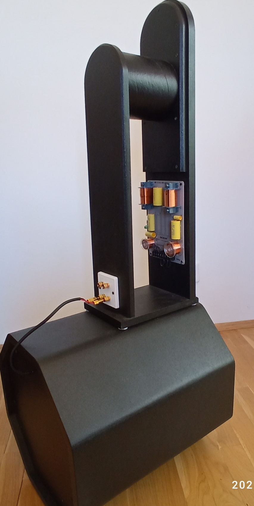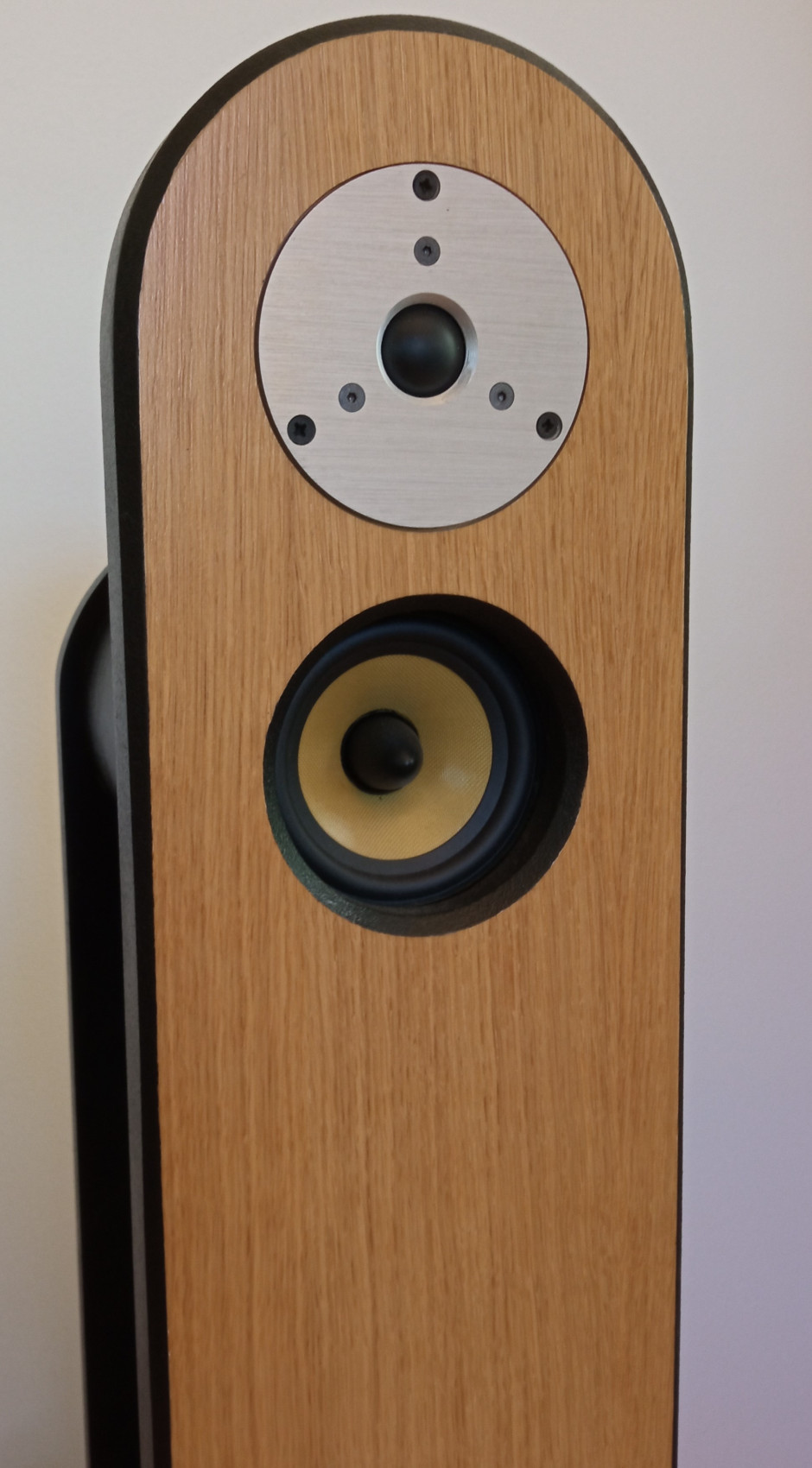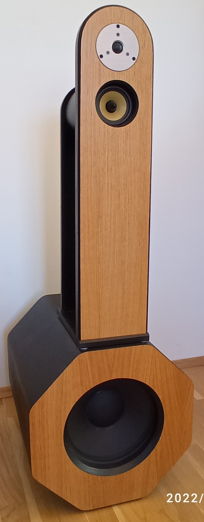 Dub v kombinaci s černou - industriál povrch. Základem zvuku je 12 palec Bayema 12BR70 , který jede až do 700 Hz, na něj navazuje Hi End ový Monacor a od 4k3 Hz známy tweetr od Bayemy. Źádný basreflex - a nějaké pufání či dunění .. pouze zvuk produkující kvalitní elektroakustické měniče s odpovídajícím Vas za sebou. Netvrdím , že to vtoleranci +-3dB zahraje 20 Hz (tj. vytvoří zvukovou vlnu o délce 17 m) ale ve srovnání s bednami , kde výrobce umístí 4 palcový středobas do 20l bednicky tvaru kvádru ( jakékoliv ceny) a v dokumentaci uvede spodní kmitočet 43 Hz hrají o level,dva lépe