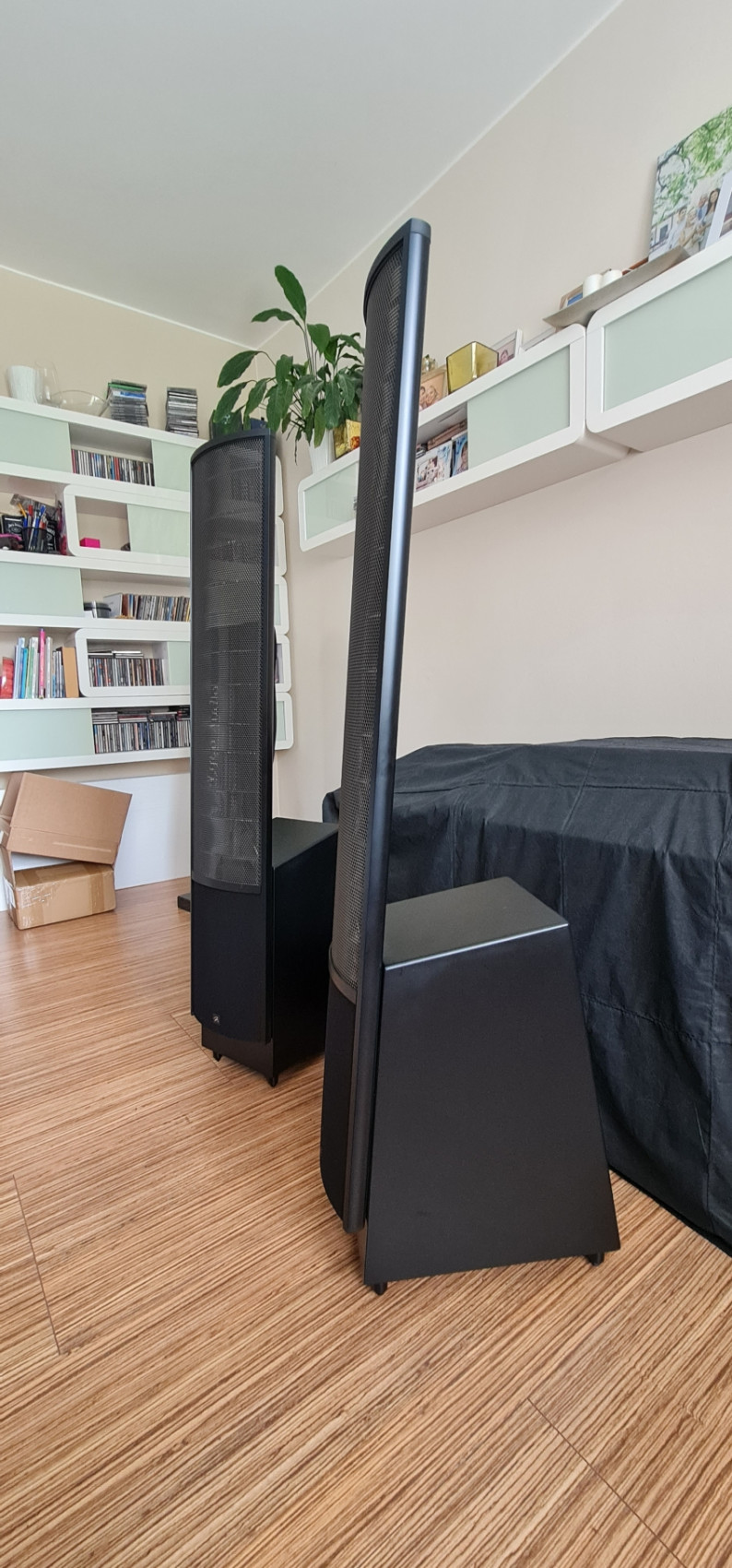 Stylové sloupové reprosoustavy, neuvěřitelný aktivní basový reproduktor, bravůrně zvládne a jistě přednese i nejnižší tóny kontrabasu. Při správném nasměrování reprosoustavy překvapí širokým prostorem. Krásně odhalí nekvalitní nahrávku. Se suverénní jistotou přehraje vše od vážné hudby po metal. Výjimečný design + perfektní hudební projev, skvělá volba. 100% stav, původní krabice.