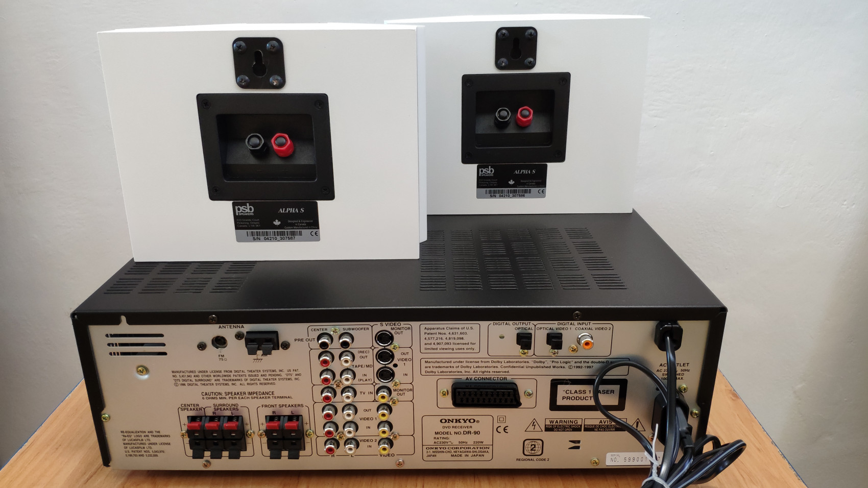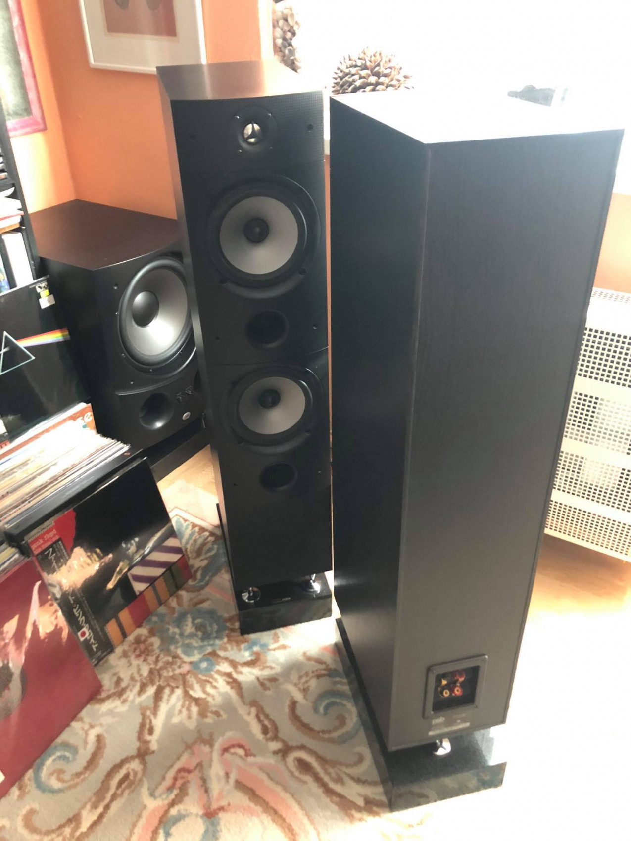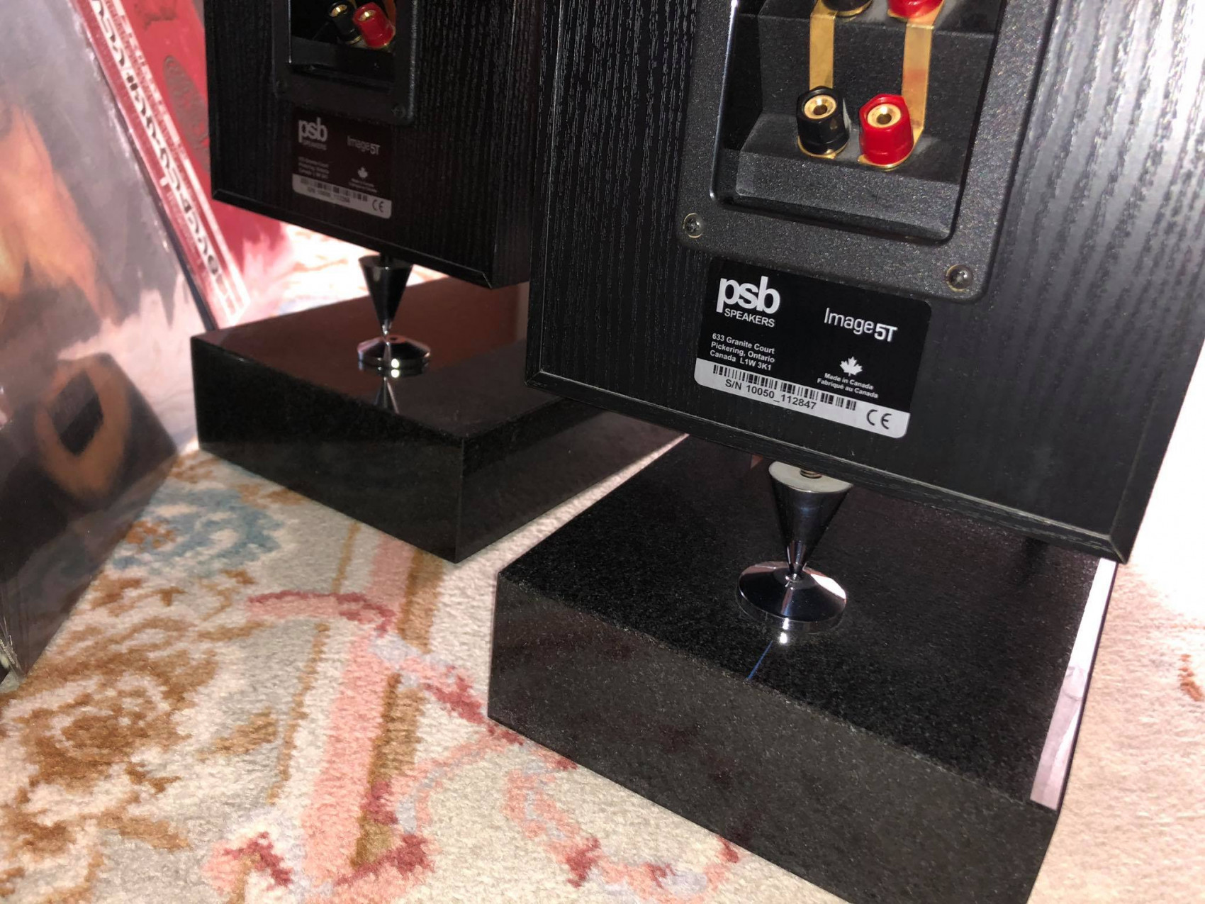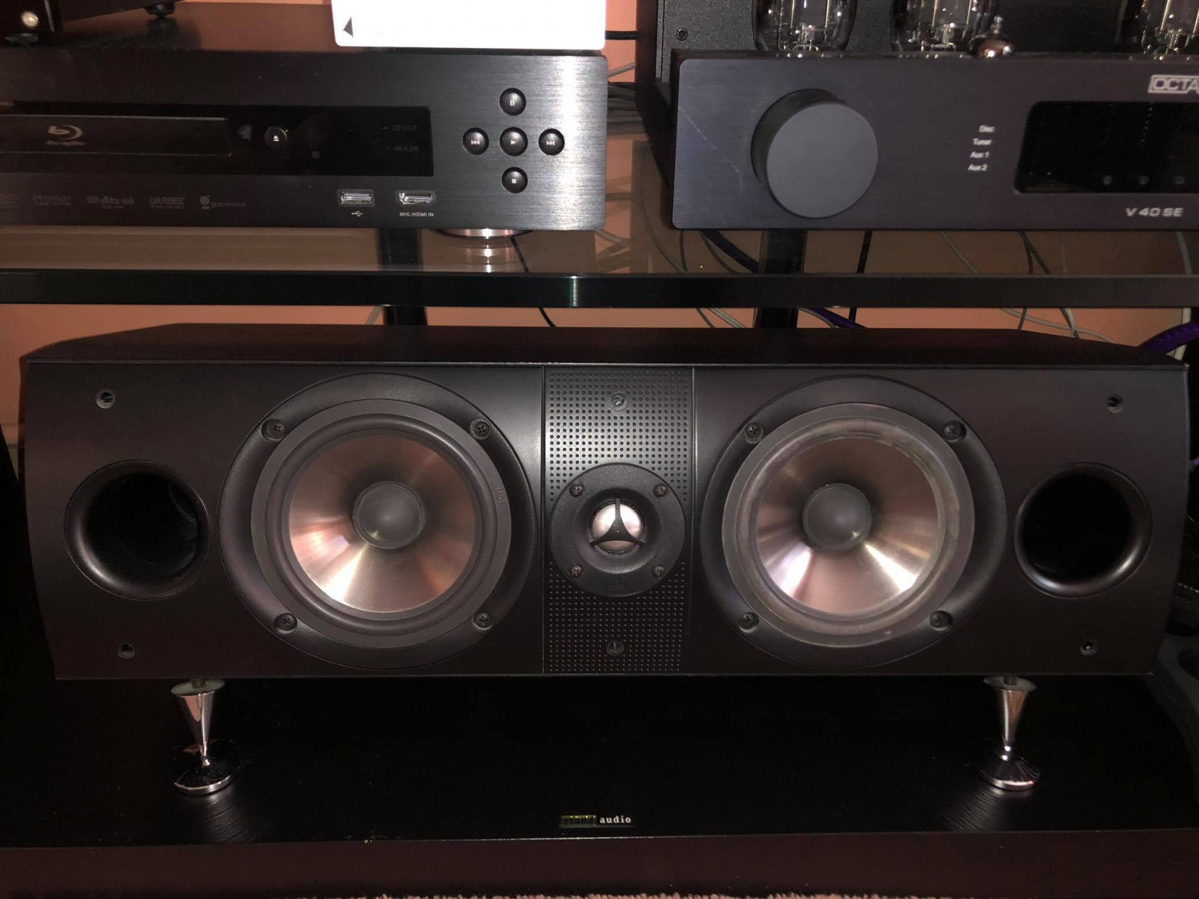 pod nimi sú žulové hranoly 10cm hrúbky (čierna leštená žula, rezaná na mieru, podľa pôdorysu reproduktora), kabeláž je použitá od značky XLO (Made in USA).
