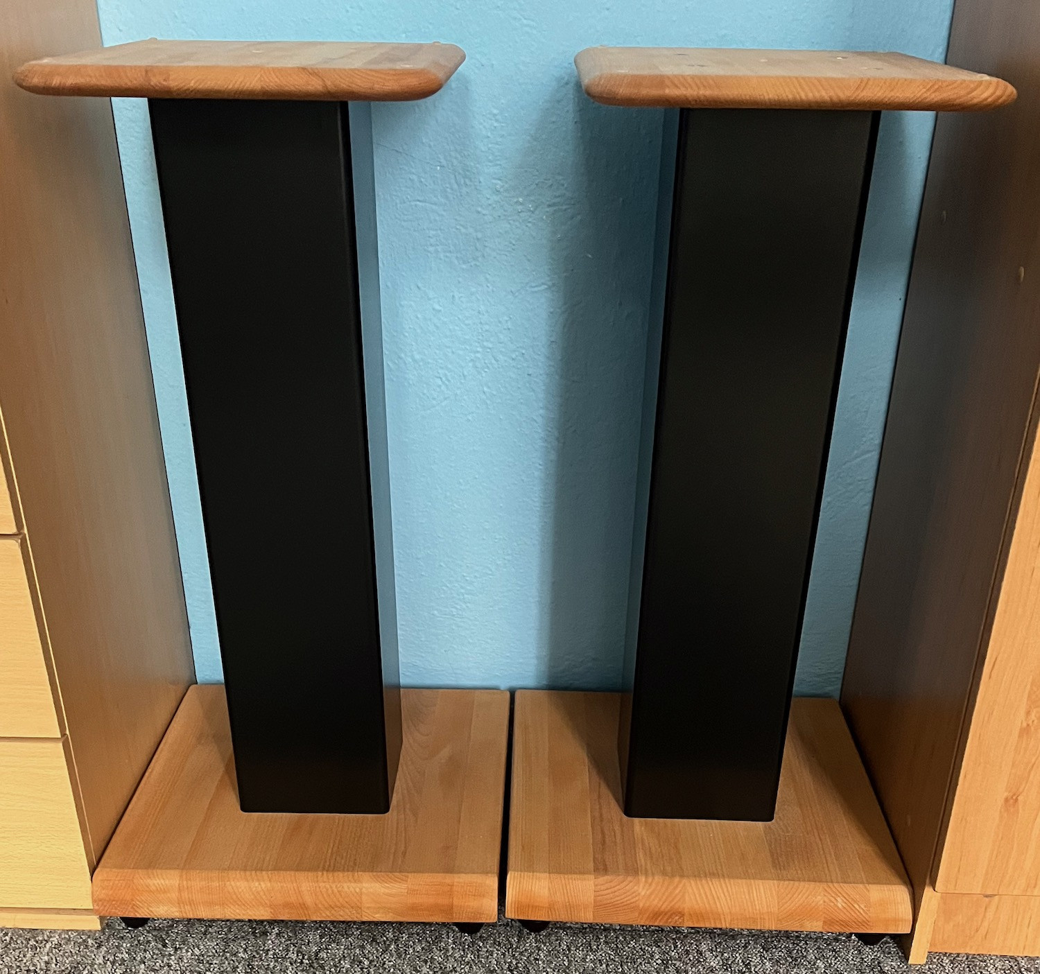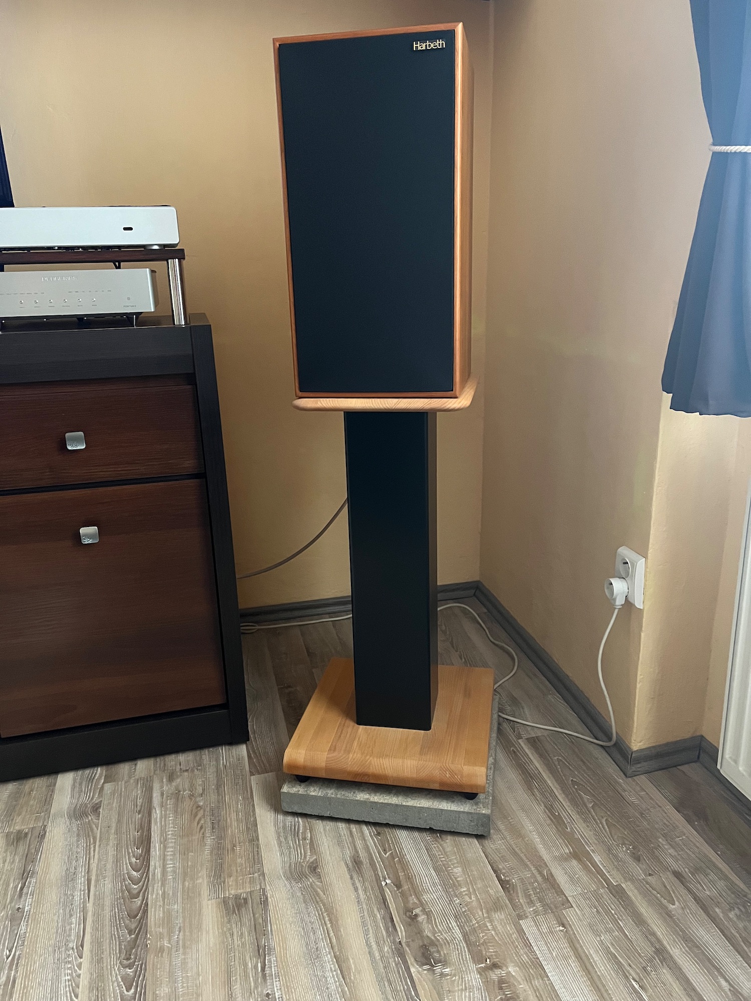 prodám na zakázku vyrobené stojany (pár) pod repro, velmi bytelné, zcela rigidní, perfektně odizolují repro od podlahy, hmotnost 1ks téměř 40kg, dubové dřevo, ocelová stojka vysypaná křemičitým pískem, matný černý komaxit, nerezové šrouby, pod stojany jsou antivibrační regulovatelné nožičky OneA v černé barvě. Mohu zdarma přidat betonovou dlažbu, která je na fotkách pod stojany.