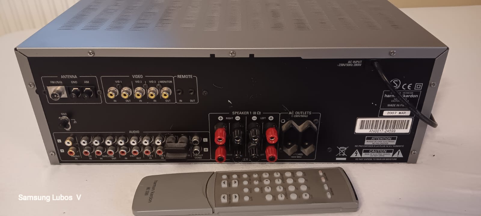 stereo receiver Harman/Kardon HK3380,2x80w/8ohm,10Hz - 110kHz, 3xvideo IN, phono IN, tape IN/OUT, cd IN, preamp OUT/main IN, subwoofer OUT, IEC 75ohm antenna, remote jacks IN/OUT, reproduktory A/B, 30 stanic FM s RDS,AM pasno, 2x spinane 230V zasuvky.Vaha: 9.48kg Modelovy rok 2003, datum vyroby 03/2007.Na dialkovom ovladaci niektore tlacidla nefunkce,existuje nahrada .