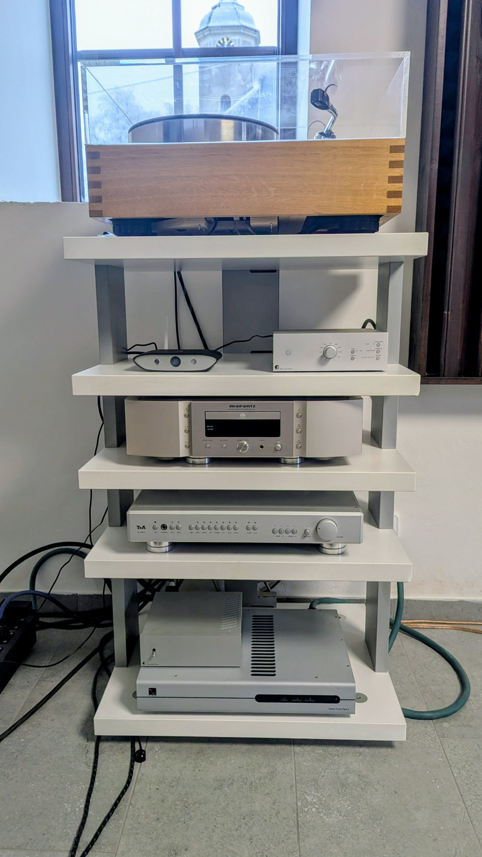 Nakonec i já u nich skončil. Dlouho mám v plánu si vyrobit vlastní rack. Který bude mít samostatné patra. Něco ve stylu Atacama. I materiál už mám koupený. Jen má pořád něco přednost. Ale chtěl jsem vyzkoušet něco co je "profi". Tento byl za bezkonkurenční cenu na bazaru. A musím říct že jsem vůbec nečekal nějaký výsledek na zvuku. Ale opak je pravdou! Nejvíce samozřejmě u gramofonu. Ale i u CD vnímám zlepšení. A není to jen v akustice. Opravdu snížení hluku v pozadí, lepší basy a výšky. Výrazné zklidnění reprodukce. Oproti tomu skleněnému stolku je to neuvěřitelný posun. Ten vliv bych řadil minimálně na úroveň signálové kabeláže. Tak pro ostatní kteří mají sestavu kvalitou podobnou té mé. Vůbec nákup dobrého racku neodkládejte. Ta investice se vyplatí!