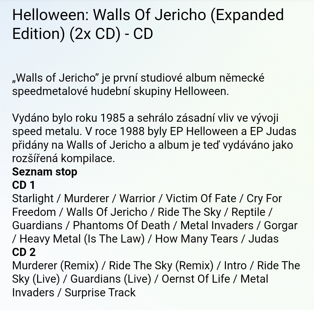 Včera o pár příspěvků výš mne zaujala fotka Helloween Walls ofJericho. Uvědomil jsem si, že jsem to vlastně nějakých 32 let neslyšel ( možná vyjma nějaké zábavy v podroušeném stavu), a jal se po tom kouknout na Aukru. Cena prý zaručených Japan vydání mně odradila, koukl jsem po novém .