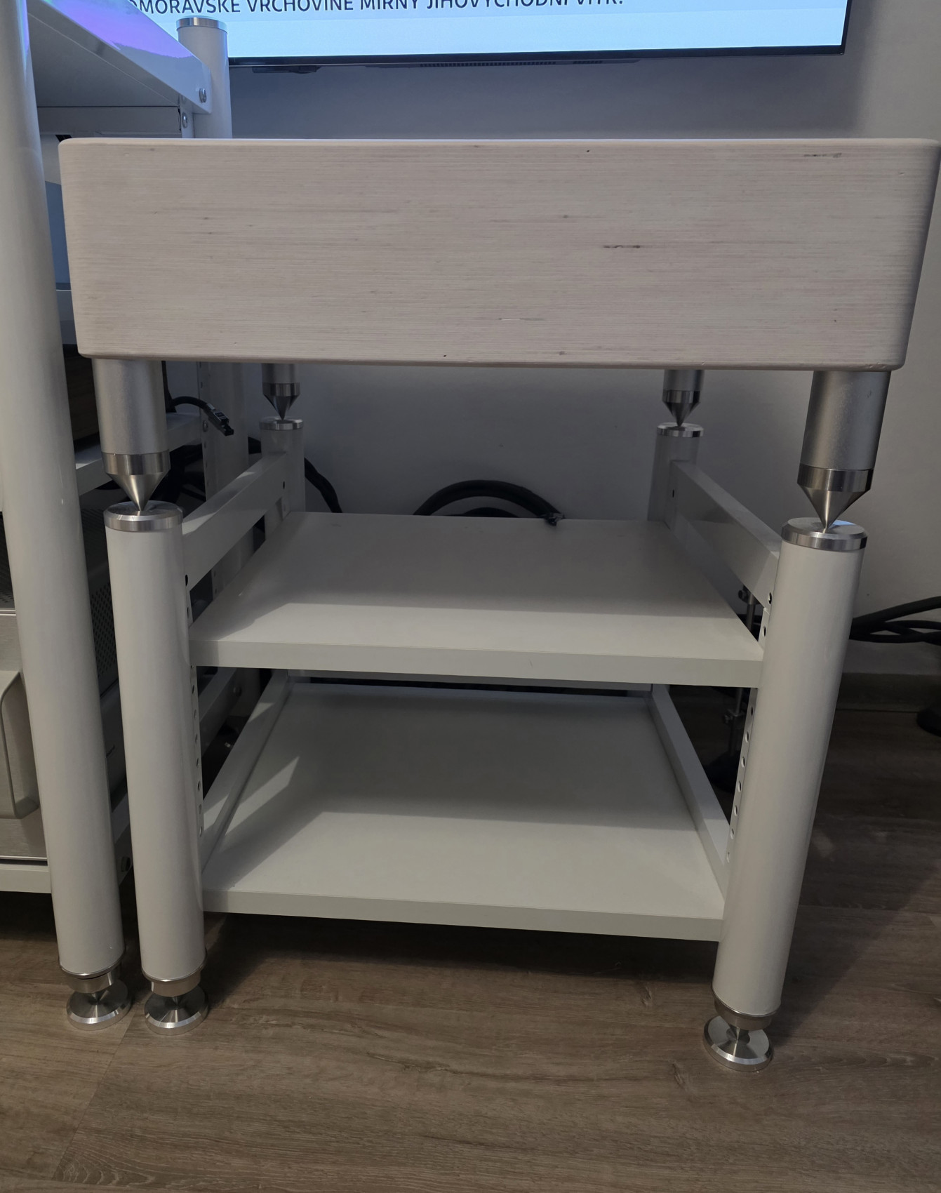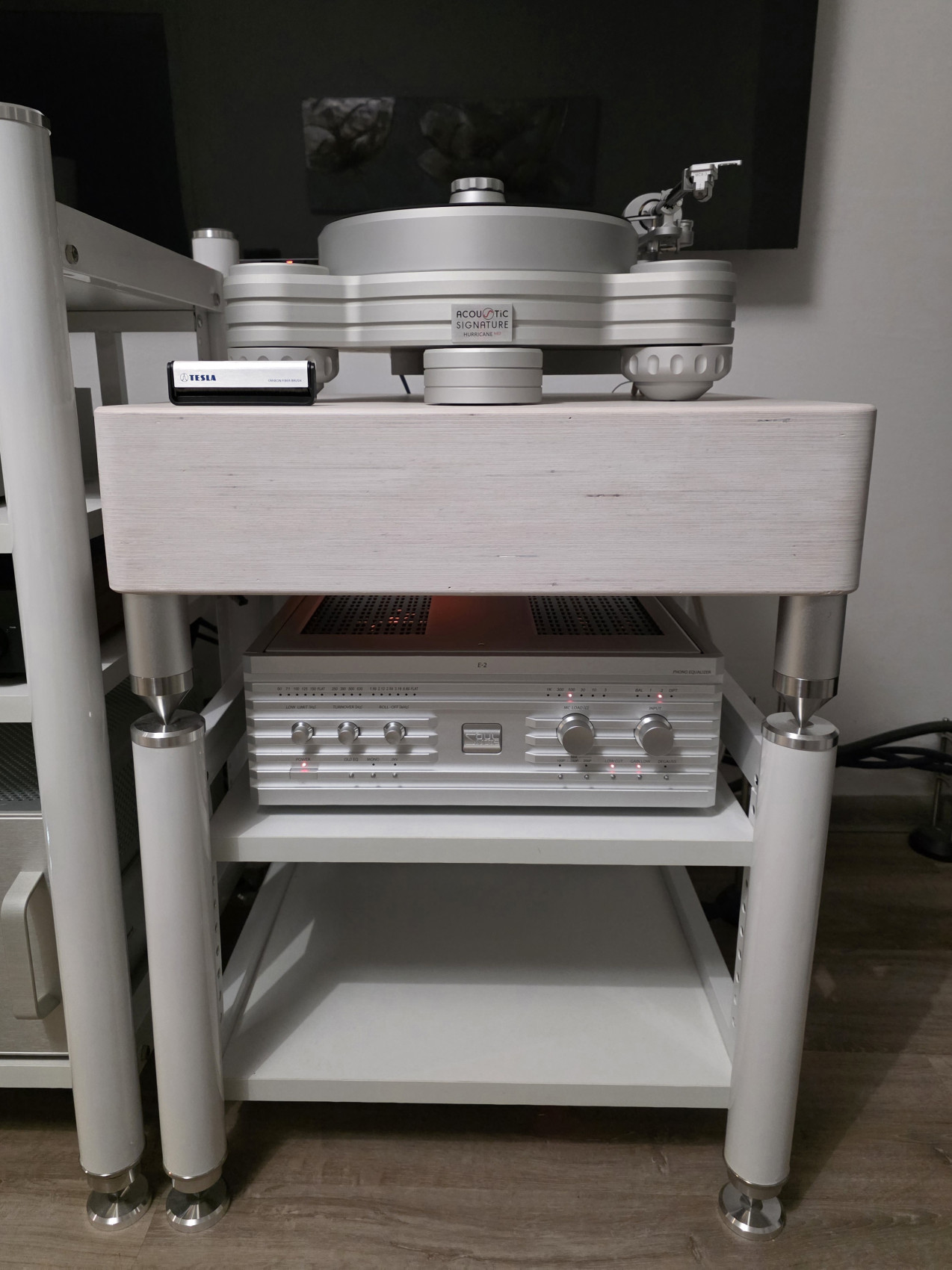 Hlásím další posun. Včera jsem instaloval novou polici pod gramofon. 8 vrstev 18mm bukové překližky. Cca 30kg. Nožky jsou dočasné, jejich výška bude podle výšky phono zesilovače a budou z nerezi.