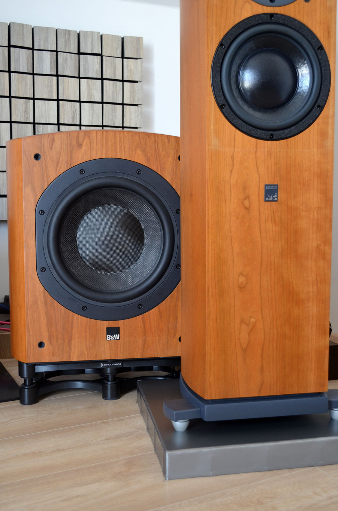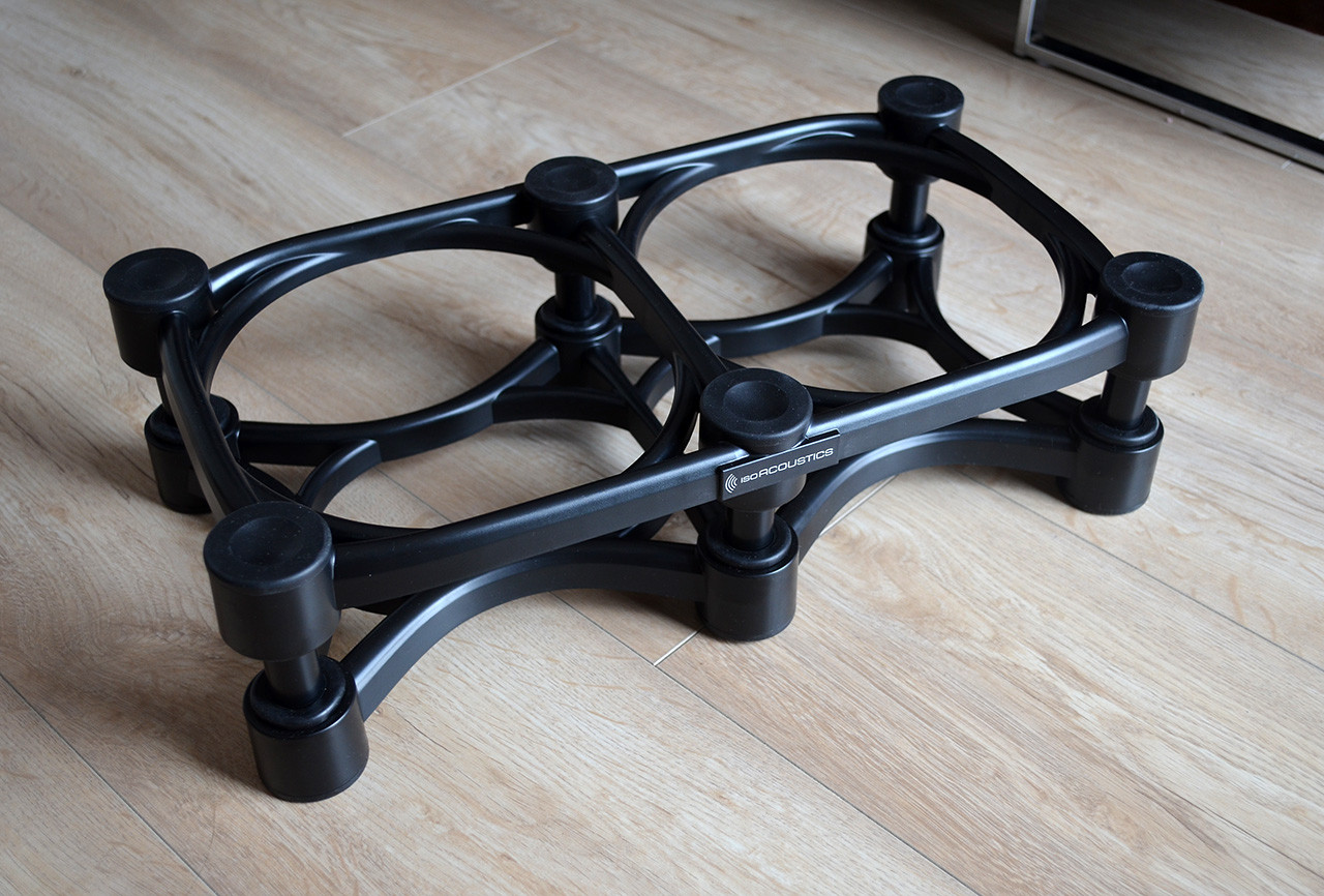 2) Další změna. Už nějakou dobu mi v hlavě zrálo, že musím nějak řešit podložení subwooferu. Zatím byl pouze na Soundcare Superspikes přímo na podlaze, což mi bylo jasný, že je na dvě věci. Samozřejmě jsem měl připravenou další betonovou dlaždici, ale chtěl jsem něco víc sofistikovanýho. Hodně serfování po emérickejch fórech přineslo ovoce. Objevil jsem značku IsoAcoustics, která vyrábí speciální stojany pod repro i subwoofery. Fungují na zcela jiném principu než třeba Cerabally nebo hroty apod. Když to zjednoduším, tak vibrace se mají "ztratit" v promyšlené konstrukci. Výrobce se zaměřuje hodně na profesionální sféru - nahrávací studia a hudebníky, takže ceny jsou směšný a pro highendistu až nedůvěryhodně nízký. Ale recenze jsou bez výjimky extrémně dobré, tak jsem to risknul. Ostatně dovozce do Evropy, německý eshop Thomann.de má 30-ti denní záruku vrácení peněz, takže nebylo o čem.