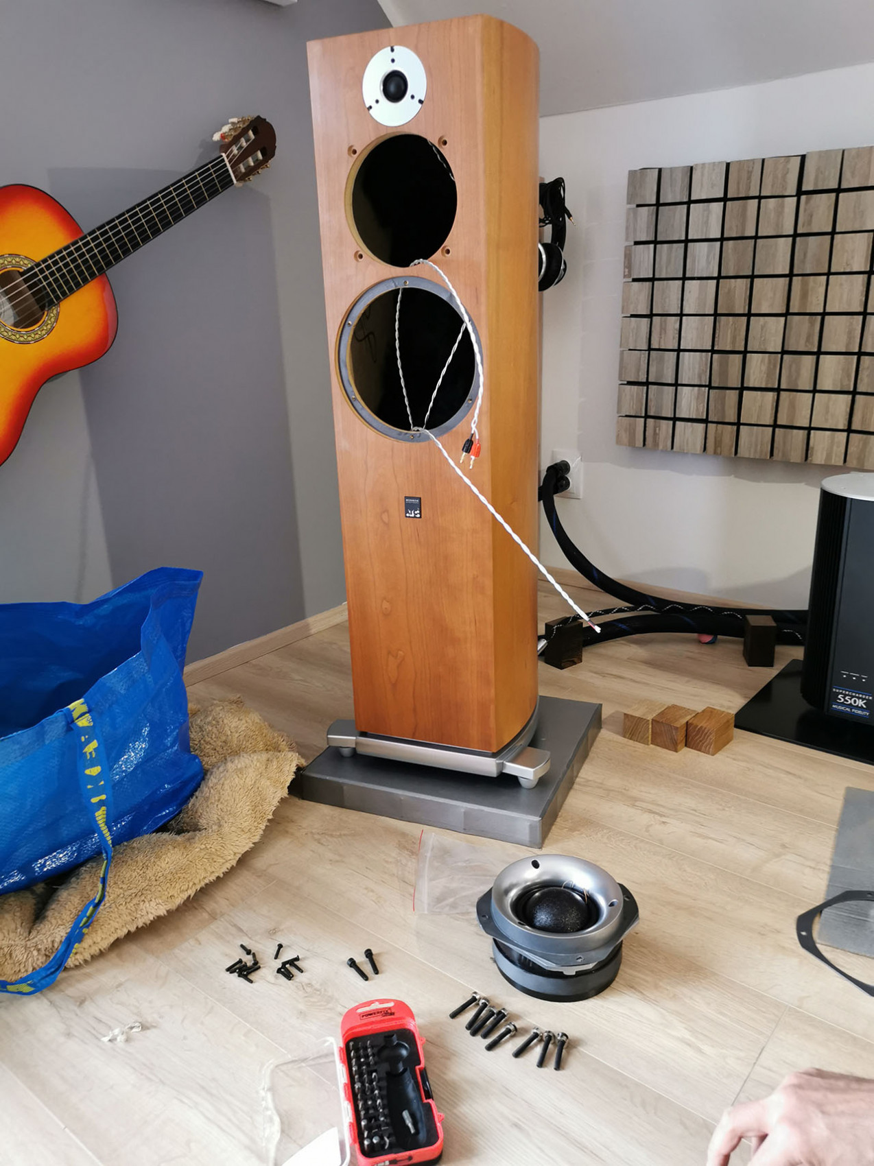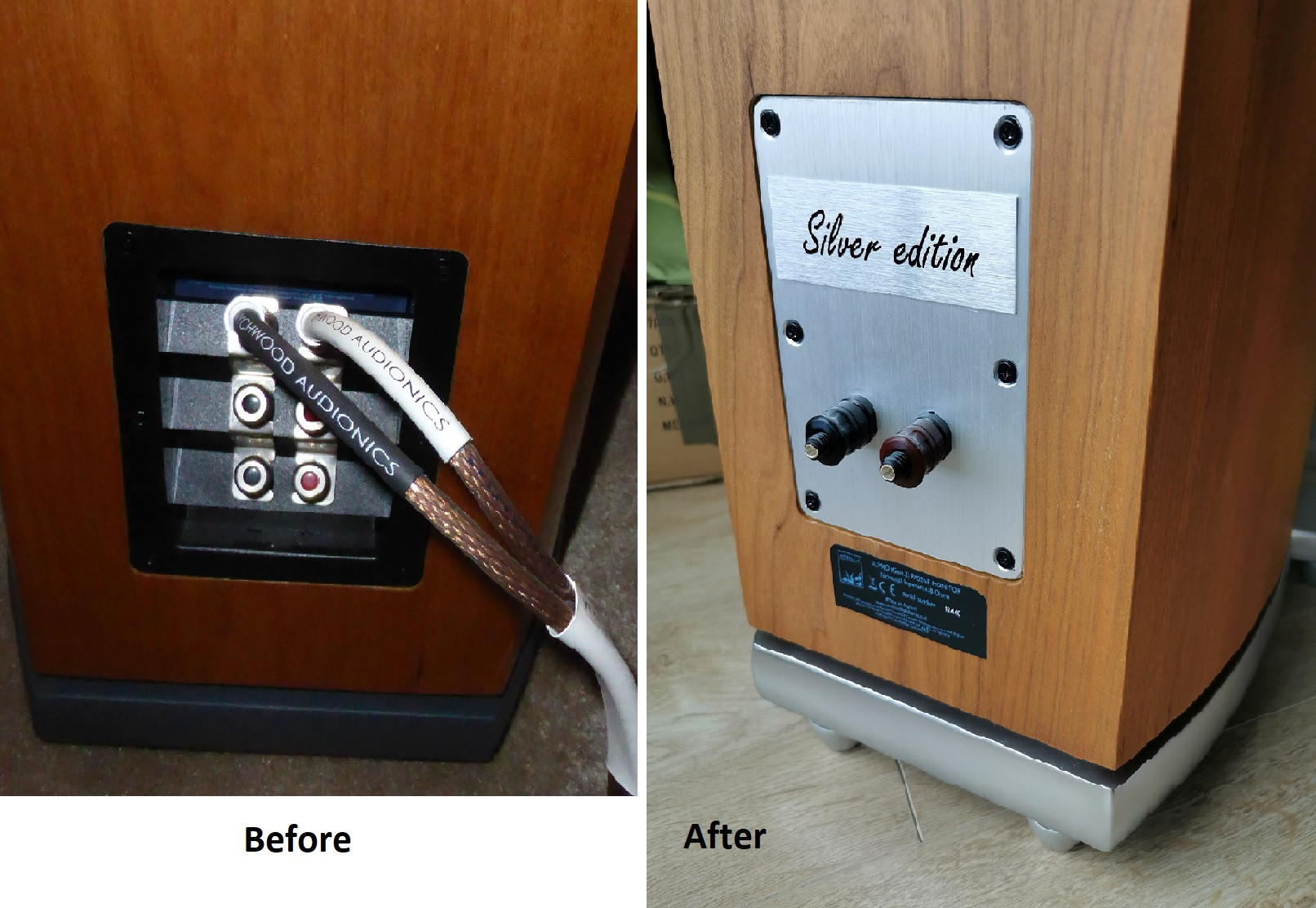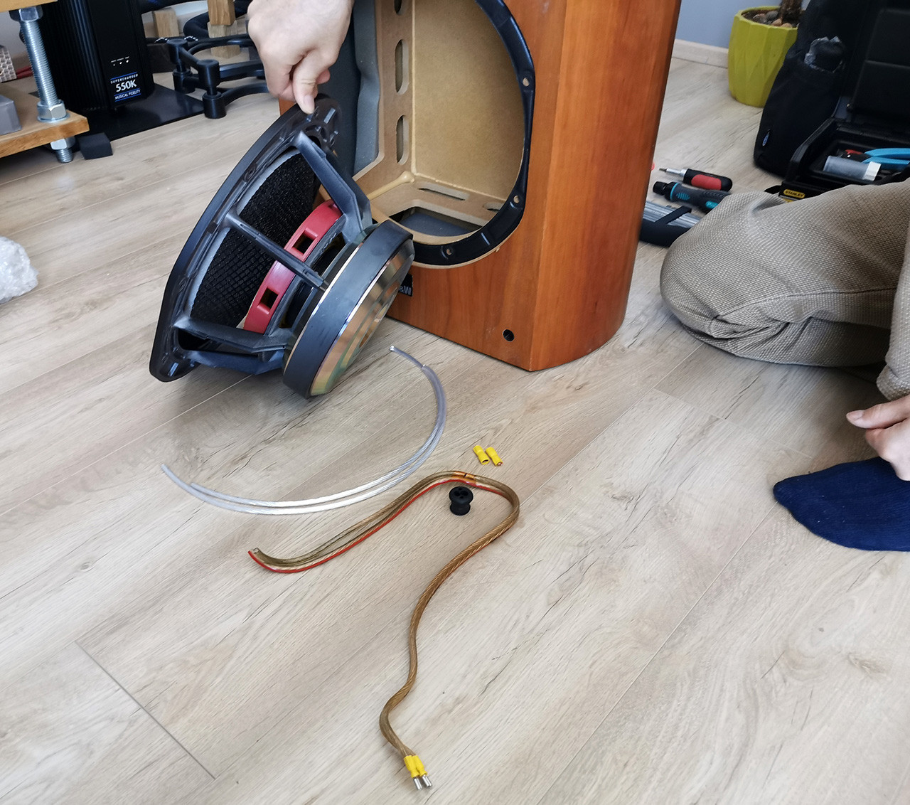 - DJ Rix z Rixaudio mi překondíkoval ICEPower 1000W zesík. Požadoval jsem to po něm sám vzhledem ke čtení mnoha historek o vysychajích elytech a následném staží opravitelném subwooferu. Věřím, že jsem si tak významně prodloužil jeho životnost. Jako bonus jsem ho i předrátoval pěkně postříbřenym 10mm2 v teflonu. Samozřejmě fastony šly pryč a letování napřímo. Vzhledem k tomu, že subwoofer hraje jen pár desítek Hz dole, nedokážu úplně posoudit jestli se něco změnilo na zvuku. To ani nebylo cílem. Vše je jak má být.