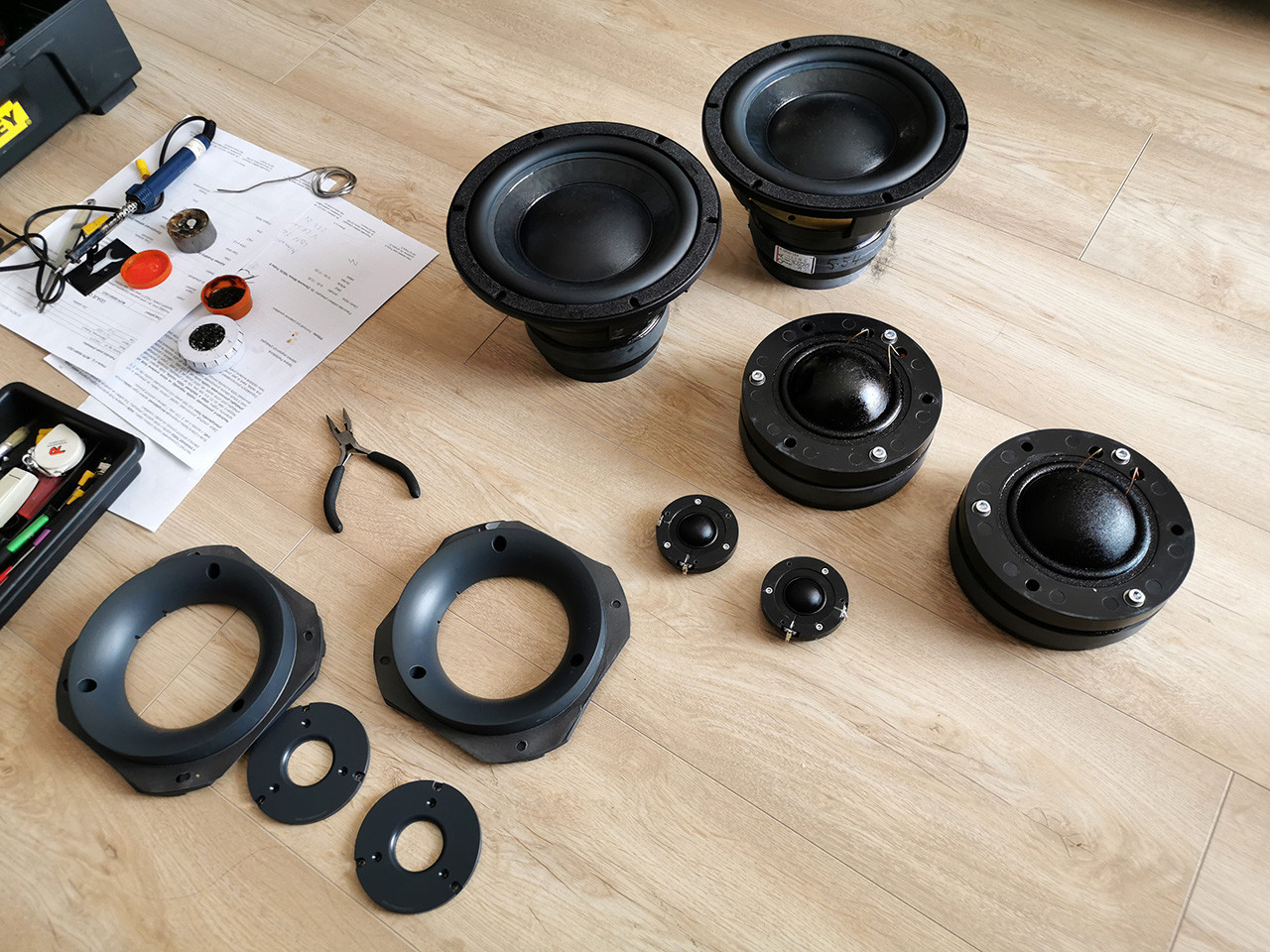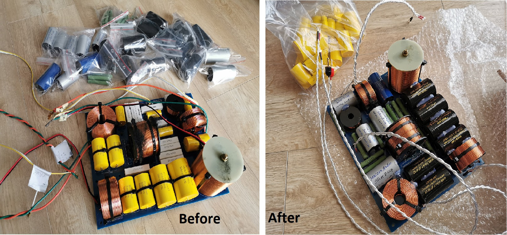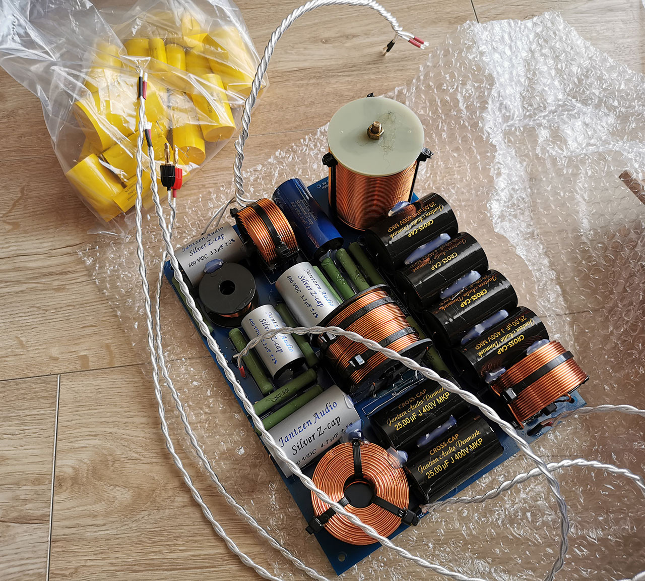 Tady se toho událo hodně. Proběhla slibovaná úprava výhybky. Neobjevily se žádný komplikace. Kondíky, kterýma se nahrazovalo, jsou sice o dost rozměrově větší (při stejných hodnotách), ale nakonec se tam vlezly o pomyslný fous. Chtěl jsem tam všude narvat ty nejkvalitnější, co jen jde, ale tenhle plán nešel zrealizovat. Moje oblíbený Janzen Silver Z Capy se vyráběj jen v omezenym rozsahu hodnot. Takže v praxi jsem musel brát i z nižších modelových řad stejnýho výrobce. Teda skládat na plošňáku hory z mnoha menších hodnot jsem fakt nechtěl. Odpory jsou taky od Jantzenu. Existujou i ještě více highendové odpory, ale tyhle už znám z předchozích repro a jsou všeobecně vnímány pozitivně.