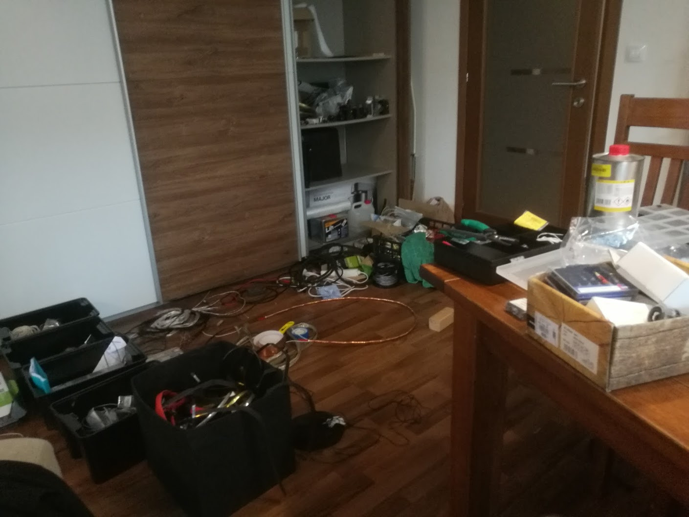 Tak první síťák ze tří hotov. Celkem tři večery poklidné práce. Fotka je z výroby, dělám většinou na zemi nebo ve stoje kvůli manipulaci s kabelem a jeho délce. Kabel je v okamžiku focení lehce před polovinou výrobního postupu, leží uprostřed fotky. Včera kolem půlnoci jsem ho dodělal. V sestavě jsem měl provizorně Isotek True32 před koncákem. který šel pryč. Zvukově se sestava okamžitě rozjela, jak kdyby dostala injekci adrenalinu.