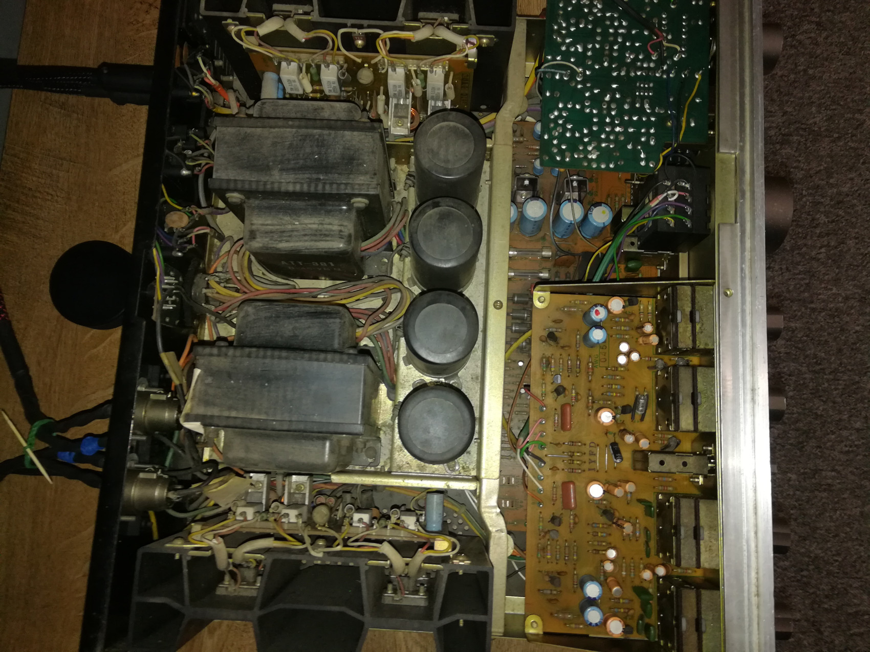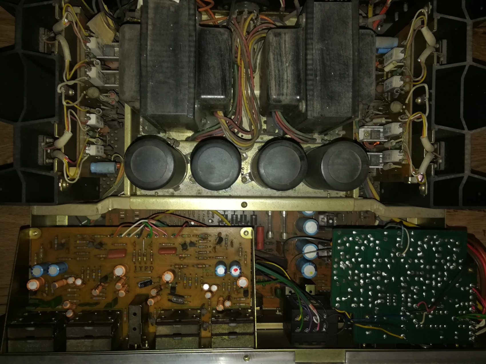 Tyhle zesíky do roku 1980 jsou asi všechny velice dobrý, řada s modrými led už tak dobrá není, to vím od více lidí co je měli, či mají. dávám ještě foto vnitřku, je to tedy pěkně špinaví, ale to se vyčistí, možná někdo posoudí zda ty bleděmodrý kondíky jsou origo ? Na netu jsem viděl černý, ale nevím jestli byly už po výměně, či to osazovali různě ? Každopádně ten zesík hraje neskutečně dobře.