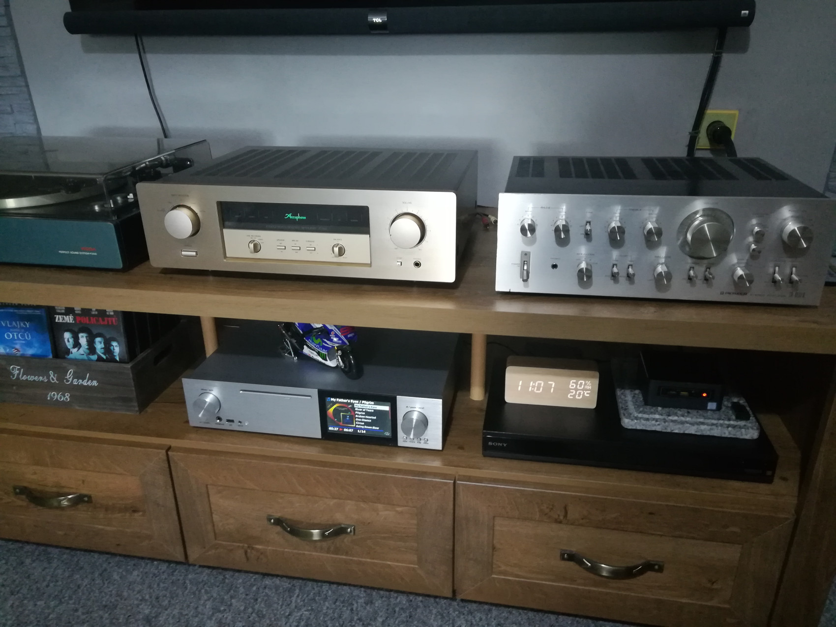 Dnes u mě bylo na poslech několik zesilovačů, u mě ve vlákně zmíním Pioneer SA 8800 který je meskyho, a zbylé dva přivezl Michal. Oba tyto Pioneery hrají skvěle, ale každý jinak. SA 8800 má přesnější zvuk oproti mému SA 9500II a je to dané tím, že jsou odlišné konstrukce. Jsou to dodnes skvěle hrající zesilovače.
