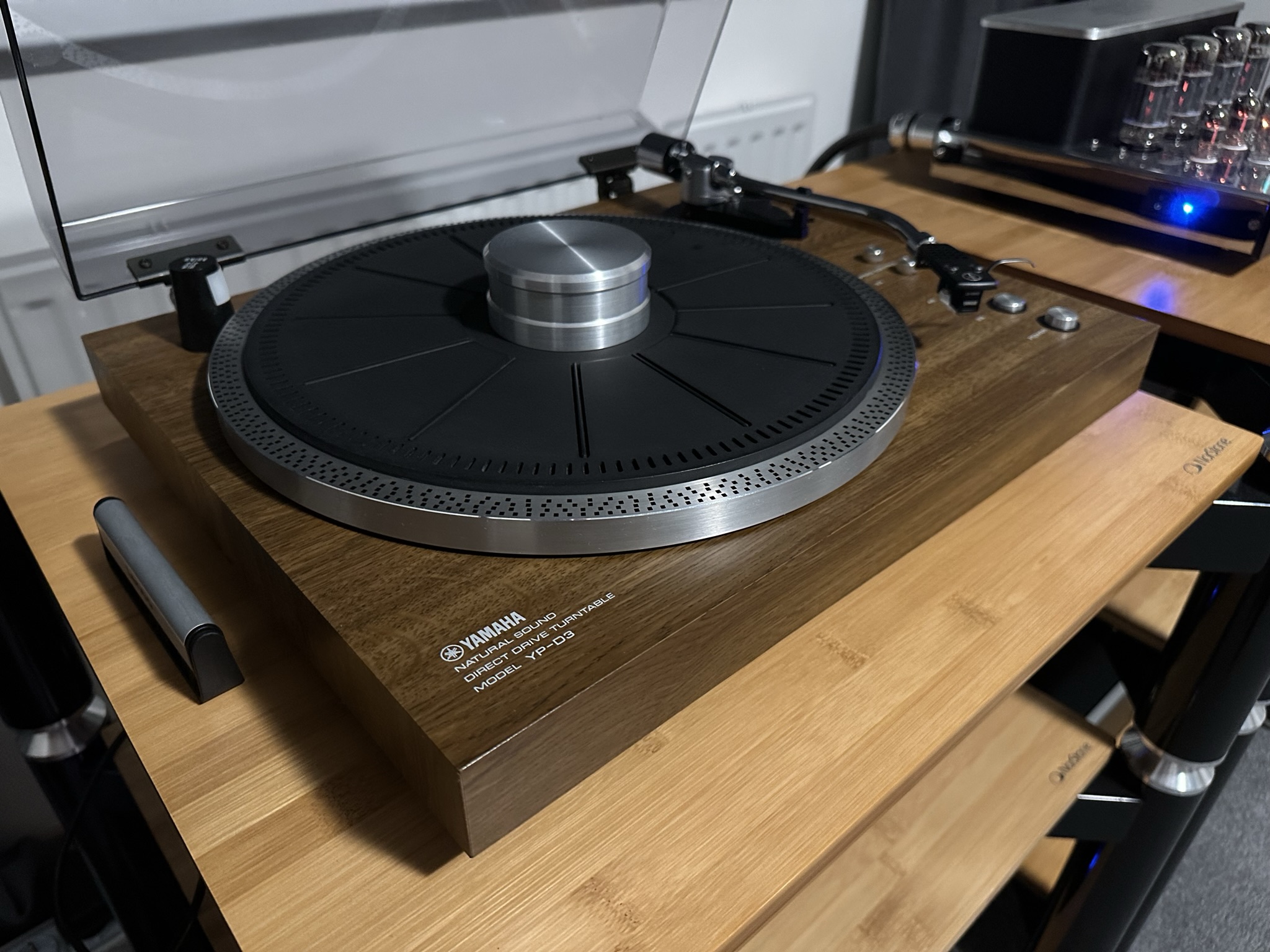 Jako první byl gramec od Yamahy model YP-D3. Musím říct, že vzhledově opravdu velmi pěkný gramofon, ne moc velký, běžná velikost, přenoska originál Yamaha. Příjemný přirozený zvuk s rozumným prostorem a velmi slušnými detaily nahrávek, dokázal bych si ho představit na pár let i u sebe v sestavě.