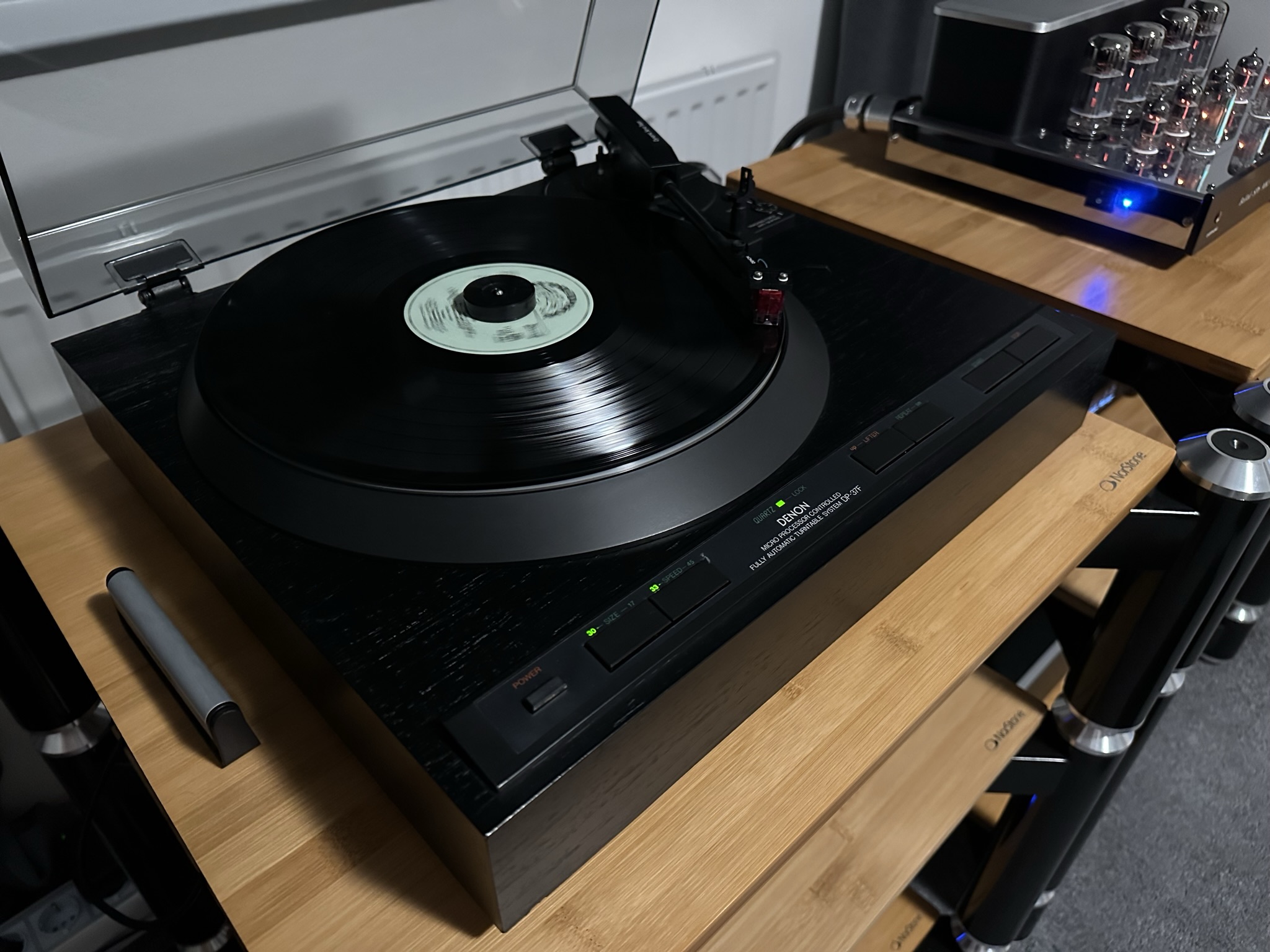 Mnohem lepší byl Denon DP-37F s Originální MC přenoskou Denon DL-110. Vzhledově nic moc zajímavého, vše v černém, slušela by mu přírodní barva dřeva nebo vysoký lesk, podobně jako vyšší modely. Zvukově to ale bylo velmi dobré, pěkný prostor a hloubka a výborná dynamika.