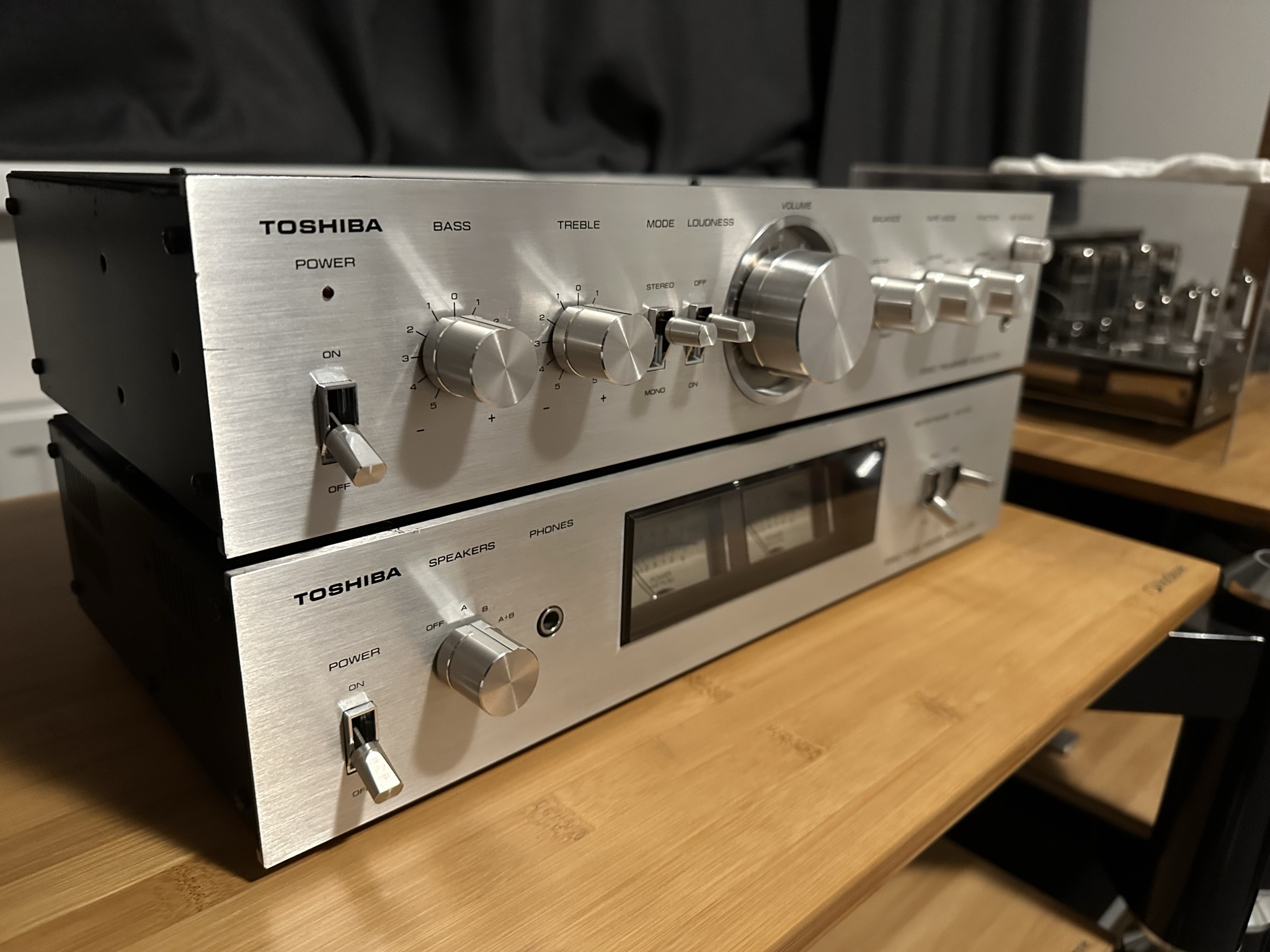 Velmi mne zaujal dělený zesilovač od Toshiby model SY/SC-335. Malý Vintage zesilovač s velmi pěkným zvukem. Nebylo to bůhví jak přesné a analytické, ale neskutěčně muzikální. Hrozně dobře se mi sestava s tímto zesilovačem poslouchala. Navíc ten vzhled a stěrače, jooooo, bylo to super pár dní s tímto strojem.