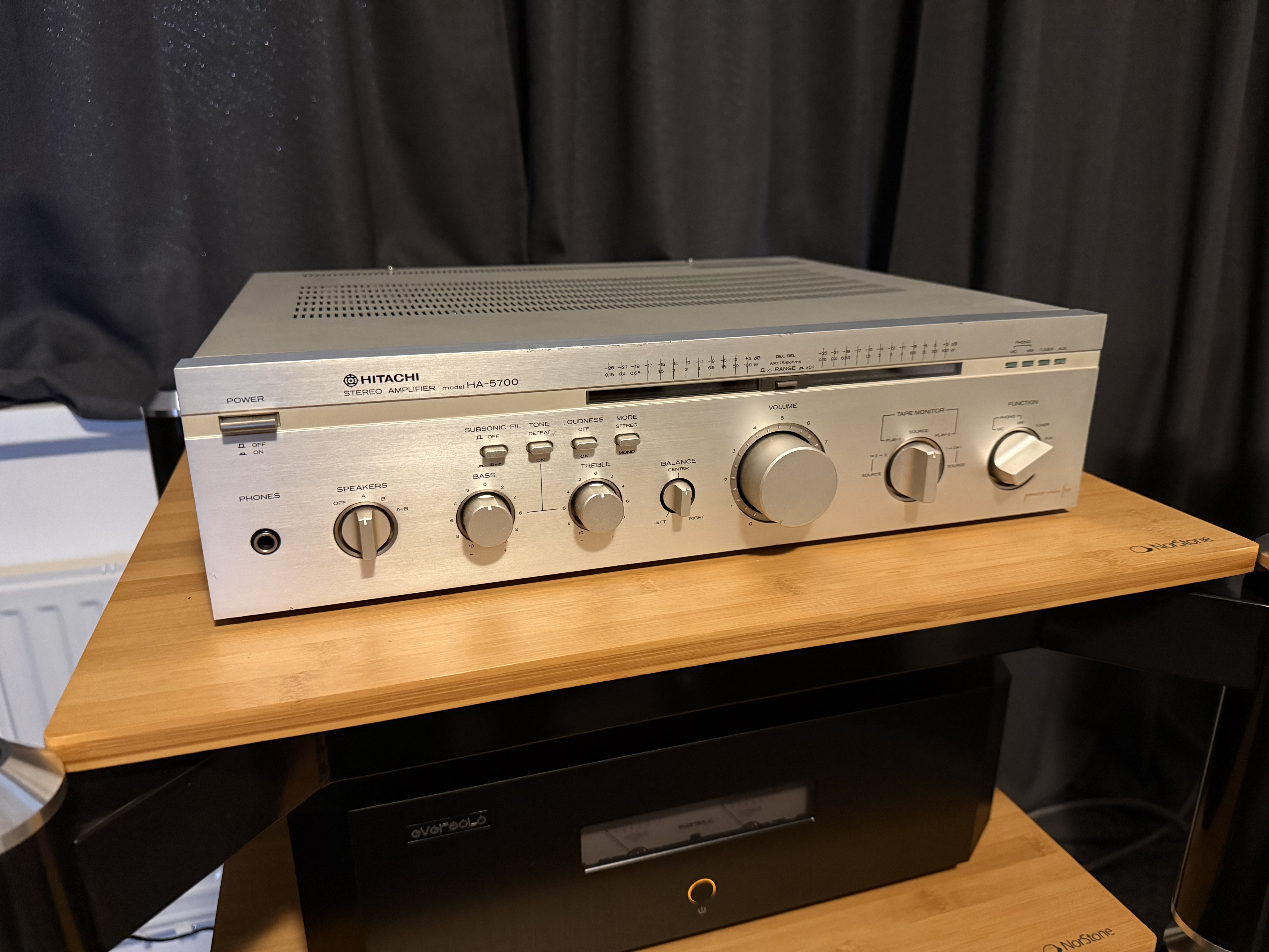 Ze zesilovačů toho letos moc zajímavého nebylo. Za zmínku snad stojí jen zesilovač Hitachi HA-5700. Malý, ale zvukem zajímavý zesilovač pro menší prostory a trochu citlivější reprosoustavy.