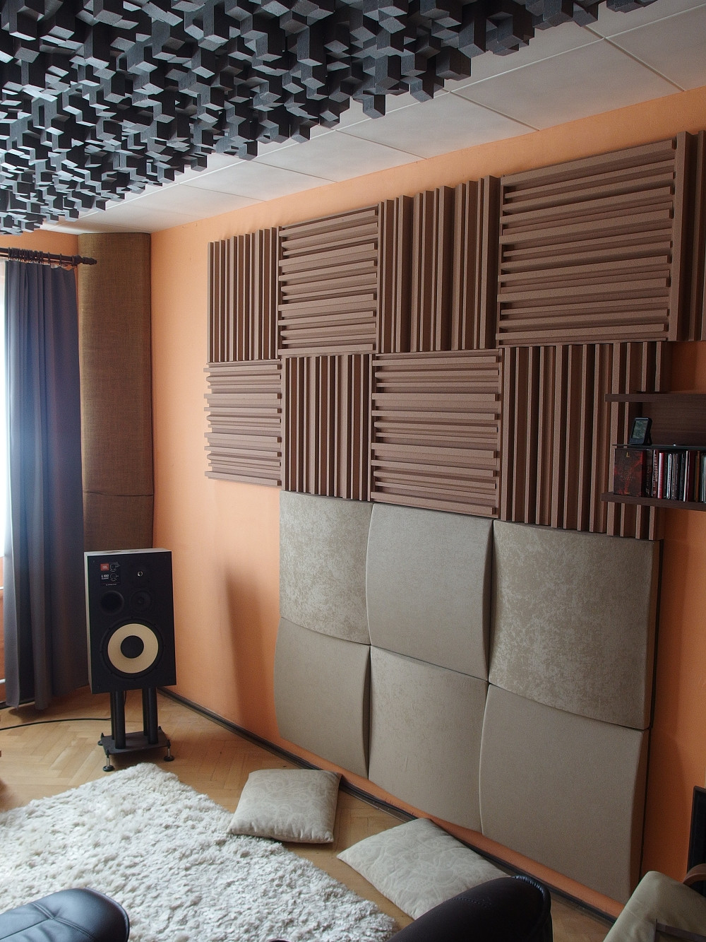 Na stropě a dole na bocích jsou difuzéry od firmy Vicoustic