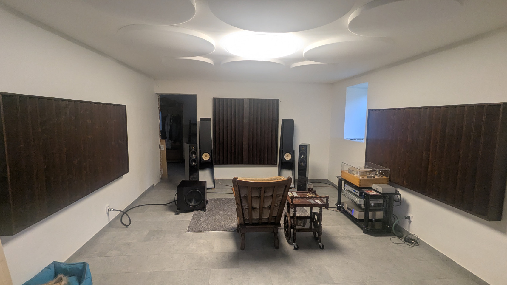 Finální úpravy a nastavení sw. budou následovat až budu mít dveře. Nějaký prostor pro difuzi sem si nechal hned vedle beden. Ale jak tam nemám dveře nechce se mi nic plánovat dopředu. Pak jestli bude problém s dozvukem na basech mám rezervu ještě v pravém rohu + ve středu stropu nad panely. Na zem to nikam dávat nechci kvůli prachu. Ale to uvidím jak moc to bude potřeba.