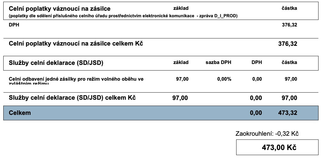 Tedy ve tvým případě je kurz CHF na Kč nějakých 24,2 Kč (a "nějaký drobný") a tudíž se DPH vypočítává: (70 x 24,2) + 97 = 1791 x 0,21 = 376,11 Kč, to je to výsledný DPH. K tomu připočti ten poplatek 97 Kč za zastupování Českou poštou v celním řízení a po zaokrouhlení máš těch výsledných 473,00 Kč.