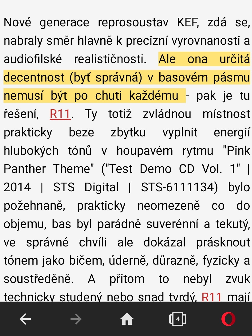Ani jeden z tvych postů nehovoří o R11 ve smyslu, ze by mely nedostatek basů. První post je o jinejch bednách a tudíž je tvuj dovětek: "....to samé se děje.....", uplně mimo, no a v tvem druhem příspěvku se dokonce o R jedenáctkách píše jako o možném basovém řešení toho, co jsi zažlutil. Význam článku je tedy zcela opačný. Autor chtěl všem povědít, že moderní KEF nemusí být ohledně basu po chuti každému, ale toto řeší R11, které mají dle pokračování článku basů až až.Takže svojí osobní zkušenost máš, to je fajn, ale to cos postl je haluz.