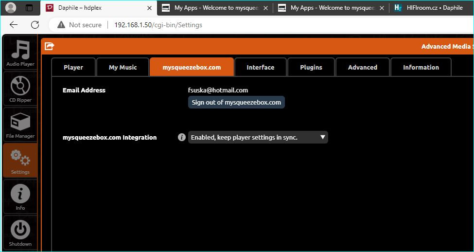 3) Teď si v prohlížeči otevři administraci Daphile a přejdi do "Advanced media server settings". Je tam záložka "mysqueezebox.com" a tam zadej účet a heslo z bodu 1).
