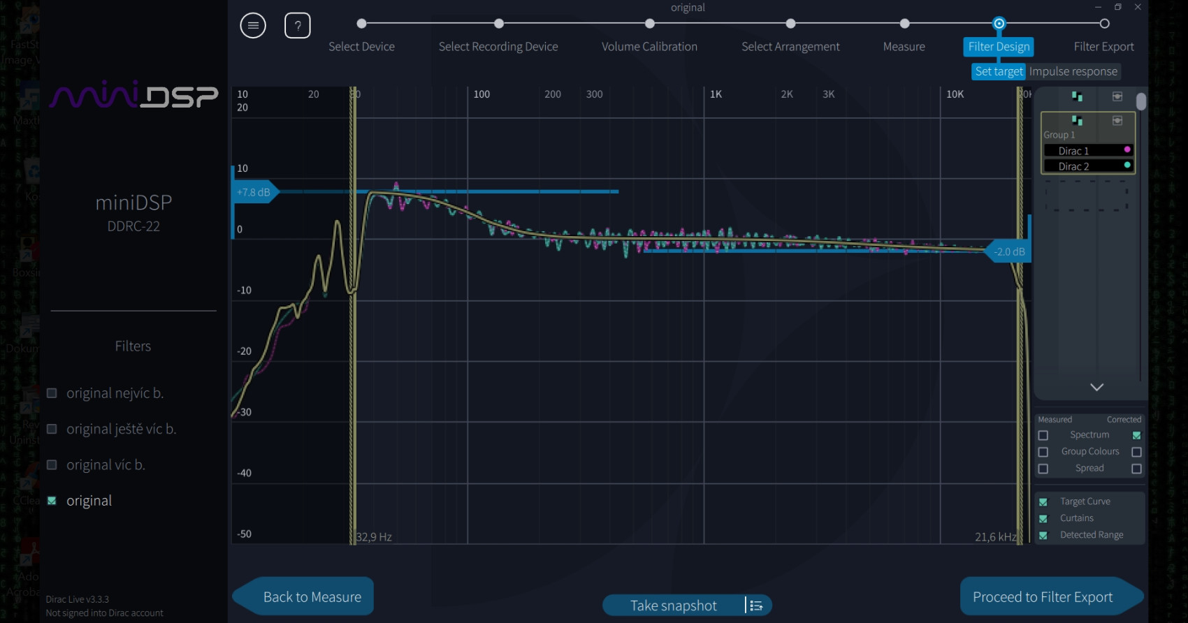 Dirac live je v podstatě digitální equalizér,který ti po změření jim definovaných bodů (obrázky nahoře) navrhne určitou frekvenční křivku,kterou si můžeš ještě sám upravit podle svých preferencí.Já mám krabicovou verzi mini DSP,potom ještě je verze pouze pro počítač,ta se jmenuje trochu jinak.Každá verze funguje tak,že in digitální data,out digitální data,potom až převodník,atd.