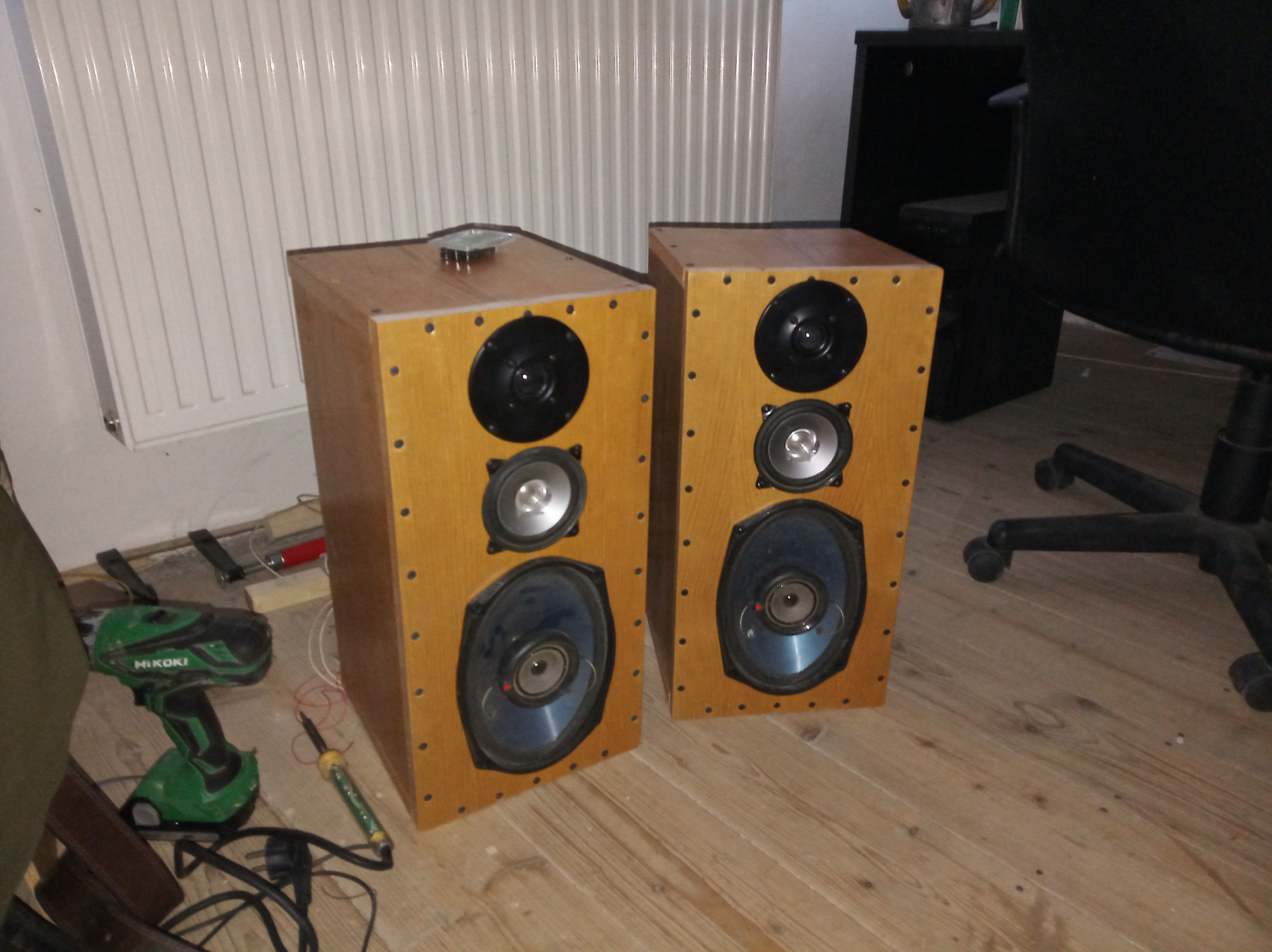 Viz. příloha jsem vyrobil reproduktory. Uvnitř je trojcestná frekvenční vyhýbka (20hz-1khz, 1-7khz, 7khz-20khz). Ty spodní reproduktory fungují jako bassy (jedná se o kenwood KFC-6956). Na těch spodních repro je zároveň maličký reproduktor, který má svůj vlastní magnet a vedou k němu drátky skrz velký reproduktor. Tyto malé reproduktory teď vůbec nehrají, protože do velkého repro jde právě do 1000hz. (všechno je 4ohmy, 25 rms, 100-120 peak)