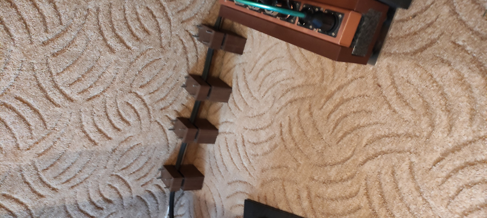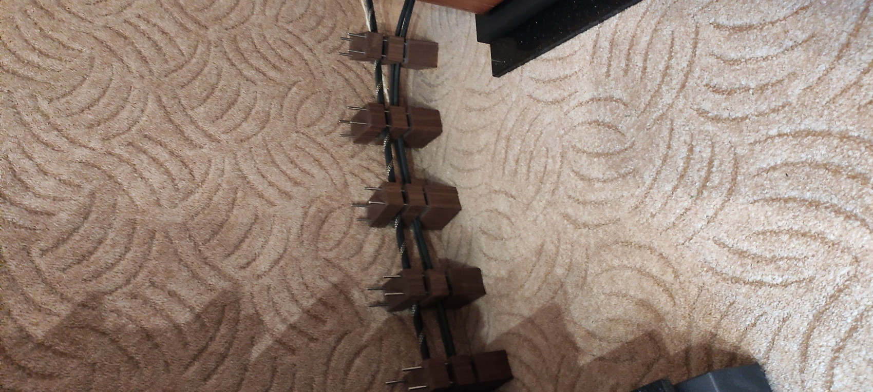 Aby se neválely kabely po zemi, mám je vyvěšené na stojánkách z wenge a nerez.kulatiny.
