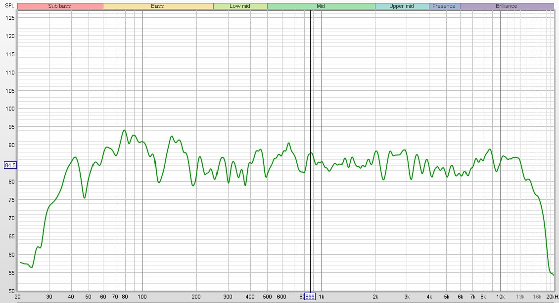 Časem jsem zjistil že tvar této bedny není příliš dobrý. V simulacich v programu Hornresp jsem zjistil že mi bedna hodně zesiluje oblast 150-500Hz. Správně by se horna měla pozvolna připojit podle typu měniče už kolem cca 1kHz. A pokračovat zesilující směrem dolů k hlubším tonům. Jenže tato bedna má tvar rozvlněného oblouku. Byla by potřeba úprava víc jak poloviny bedny abych docílil většího rozšiřování horny. A to už prostě nelze. Tak jsem se rozhodl si jen pohrát s tlumením. Jak v prvním sloupci směřujícím nahoru, tak položením na dno bedny. Vše s cílem utlumit tu problémovou oblast. Nové měření: