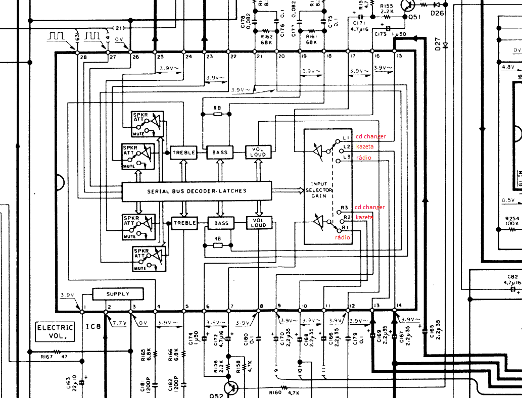 Tak jsem se zorientoval ve schématu, pokud nevyjde simulace přítomnosti cd changeru pomocí rezistoru, mám několik možností, kam připojit signál.