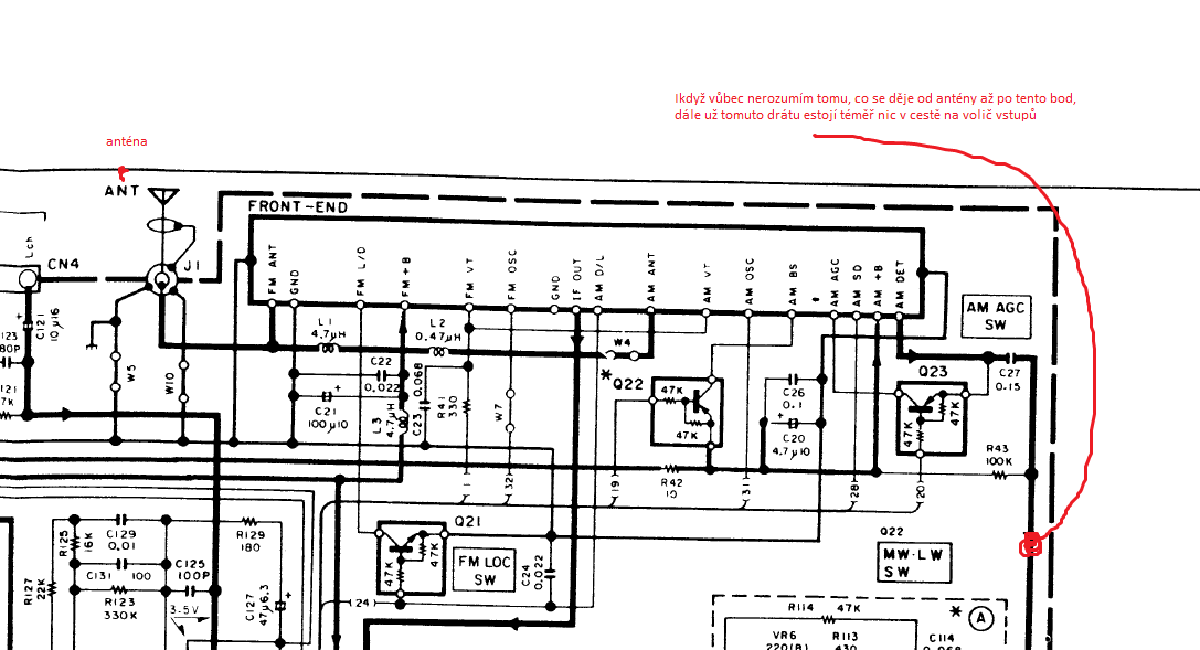 drát označený na obrázku (anténa s výstupem AM )vede jako vstup do switching diody a rozděluje se na dva dráty, které vstupují do input selector gainu - mám to chápat tak, že signál z AM je mono a touto diodou se rozděluje na stereo? Dále mi pak vrtá hlavou, jak se zvolí že hraju buď AM nebo FM, když jsou na společném drátu? Tomu Co se děje s FM signálem vůbec nerozumím, ale konečný výstup je připojen na ty samé dráty jako AM z krabičky MATRIX DECODER - je vidět na posledním obrázku.