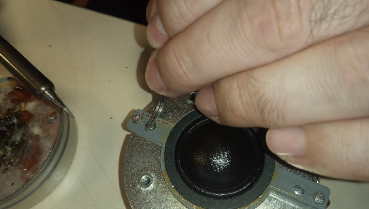 Nejprve oprava, spočívala ve vyříznutí staré kmitačky a očištění plastového rámečku: Poté nalepit novou kmitačku přesně doprostřed kolečka, pěnu jsme nesundávali, protože jsme napřišli na to jak. Trhala se i s kmitačkou. Tady to je trochu nevyřešené, nechápu proč to výrobce dodává s tou pěnou. no a protože dráty vedou z kmitačky po jedné straně, tak jsme je nalepili tím stejným lepidlem po obvodu a použili drátky z UTP kabelu pro jejich napojení až na konektory. A teď to překvapení, on ten opravený výškáč hraje líp než původní v nerozbité bedně !!!