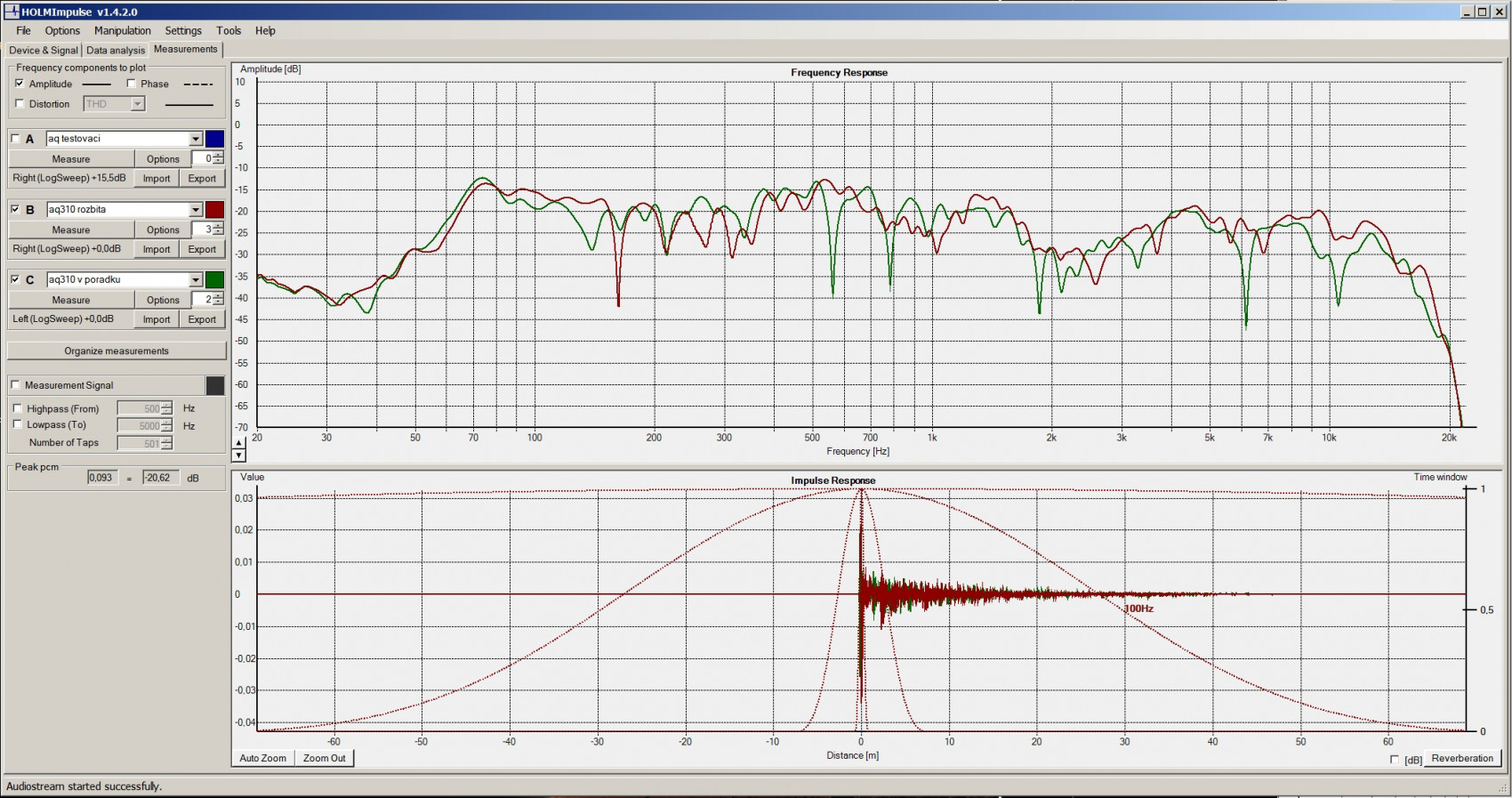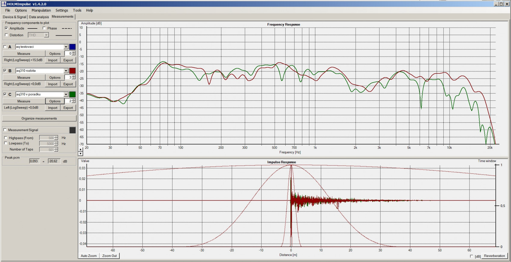 zelená čára - druhá bedna bez rozbitého výškáče. Bohužel na poslech taky hraje líp, je taková živější a bohatší na zvuky, ta původní hraje tak jakoby tlumeně. Nejspíš provedu výměnu kmitačky i na původní bedně.