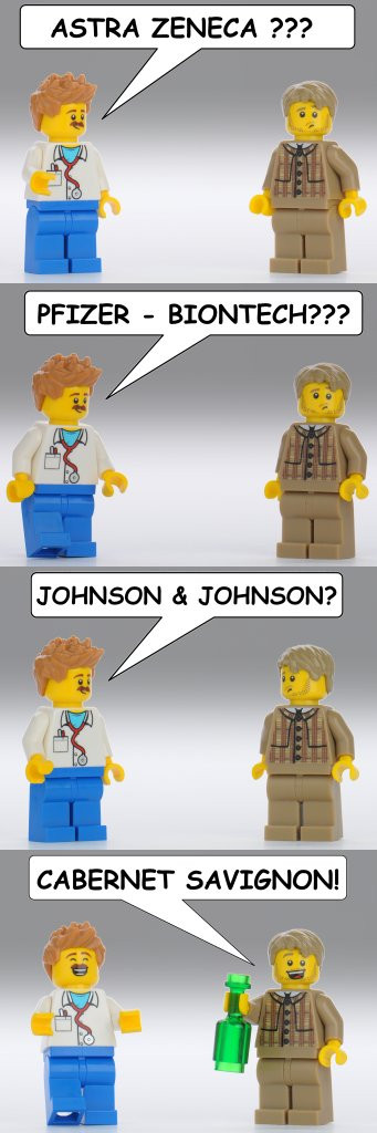 Lékař (šeptá): "Víte já jim píchnul ruskou vakcínu. Ale mám tu ještě jednu americkou, je jen pro lékaře, vlastně bych vám ji vůbec neměl nabízet, je to dokonce trestný. Ta tedy není zadarmo jako ta ruská, stojí 900 Kč..."